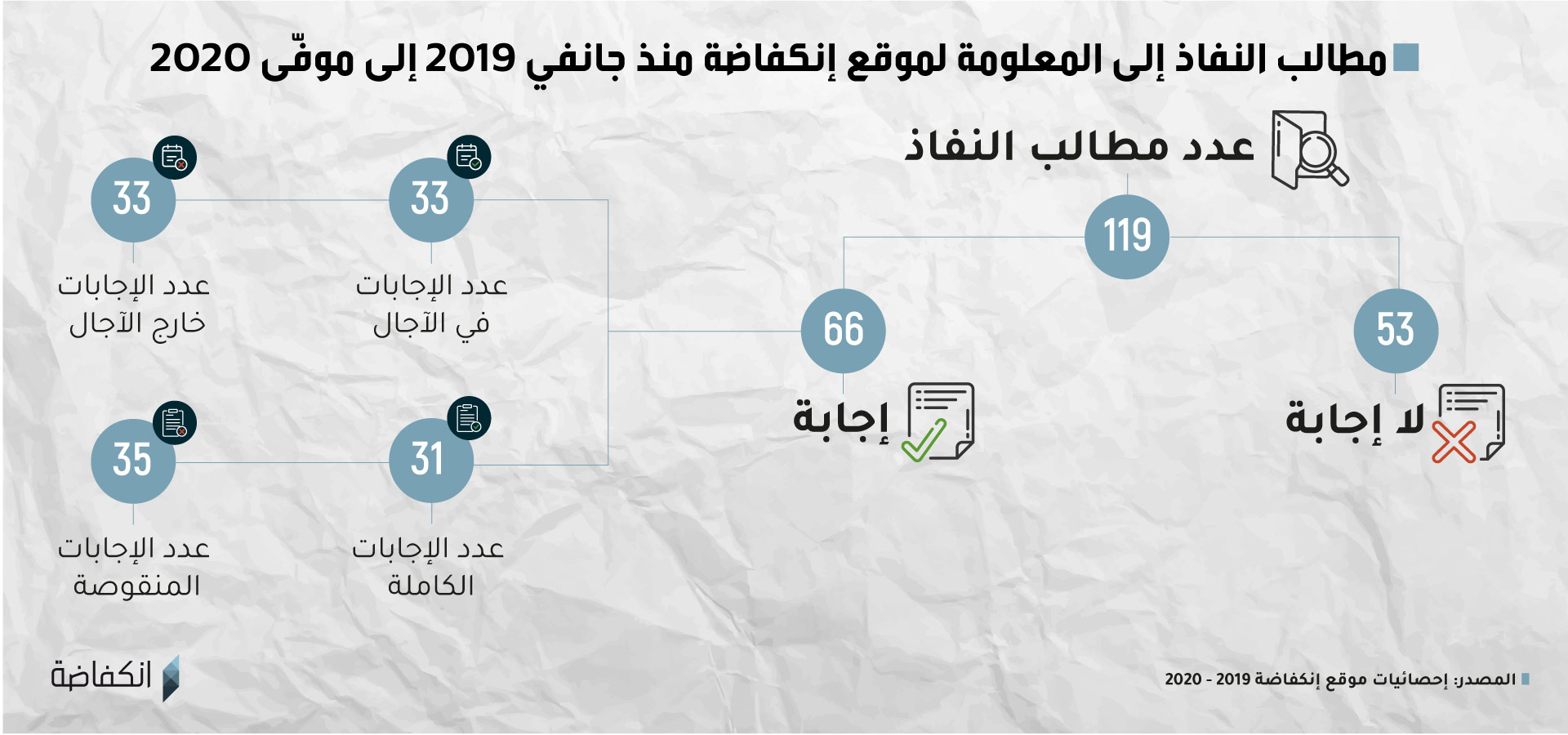 قطعت إنكفاضة شوطا كبيرا في استخدام هذا الحق وآلياته، حيث تقدّم الموقع بـ119 مطلب نفاذ منذ جانفي 2019 وإلى حدود موفّى 2020 لدى العديد من الوزارات والهياكل التي يشملها القانون. إلّا أن هذا الحق لم يلبث أن اصطدم بواقع يحدّ من امتيازاته. ففي 53 مرة من بين مجموع المطالب التي أودعها الموقع، لم نتحصّل على أدنى إجابة أو ردّ يُذكر من الهيكل المعني.