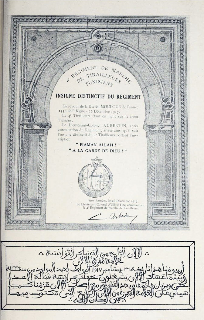 كانت الوحدات الاستعمارية مثل أفواج المشاة تُعيد توظيف رموز محلية لغوية ودينية. وكان شعار الفوج الرابع من المشاة التونسيين حمل عبارة "في أمان الله". كما حظي الفوج كباقي وحدات المشاة الشمال أفارقة بـ "نوبة" عسكرية – وهي فرقة موسيقية تستعمل آلات موسيقية تقليدية مثل الزكرة والطبل. غير أن هذا الجانب الفولكلوري كان يعيد إنتاج المخيال الاستعماري، دون أن يُلغي التمييز القائم بين الفرنسيين والتونسيين حيث "كان الضباط في غالبيتهم من الأوروبيين"، يقول الباحث جوديس، مضيفا أن "ترقيات التونسيين كانت نادرة وقليلاً ما كانت تتجاوز رتبة نقيب".