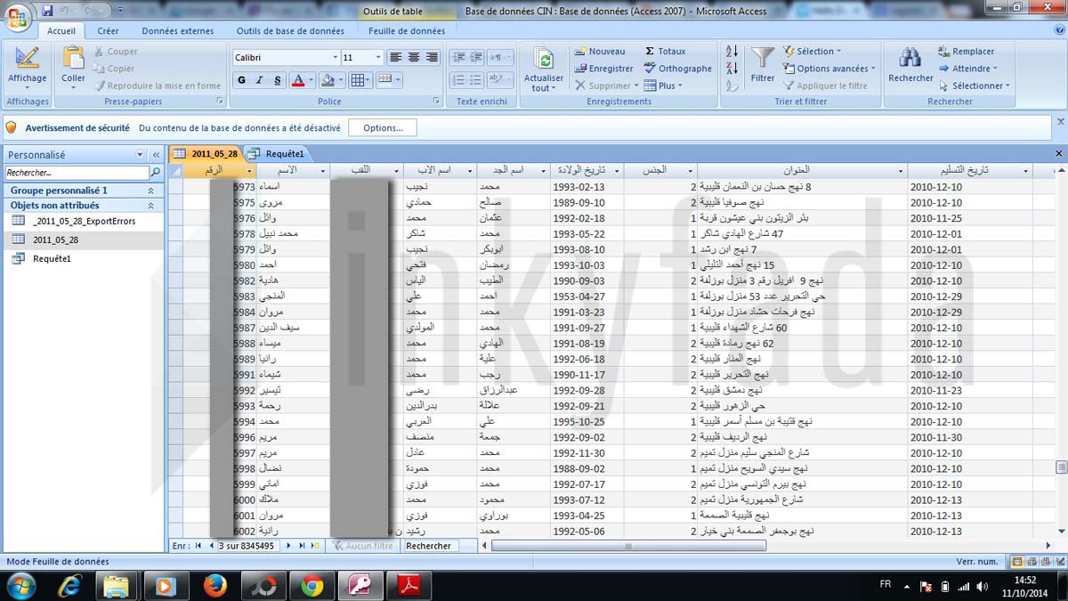 قاعدة بيانات تمّ تحديثها آخر مرّة بتاريخ 25 ماي 2011 تتضمّن أسماء وأرقام بطاقات التعريف الوطنية لنحو 8 ملايين و345 ألف و 495 .