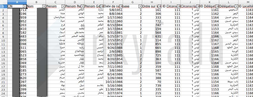 ملاحظة : هذه القاعدات البيانية التي بحوزتنا تتضمّن كمّية مهمّة من المعطيات الشخصية للتونسيين، وقد يتمّ توظيفها بشكل مشين ومضرّ بمصلحة هؤلاء المواطنين في حال وقعت بين أيدي أشخاص أو جهات تبحث عن المنفعة الذاتية تماما مثلما حدث في واقعة التزكيات.