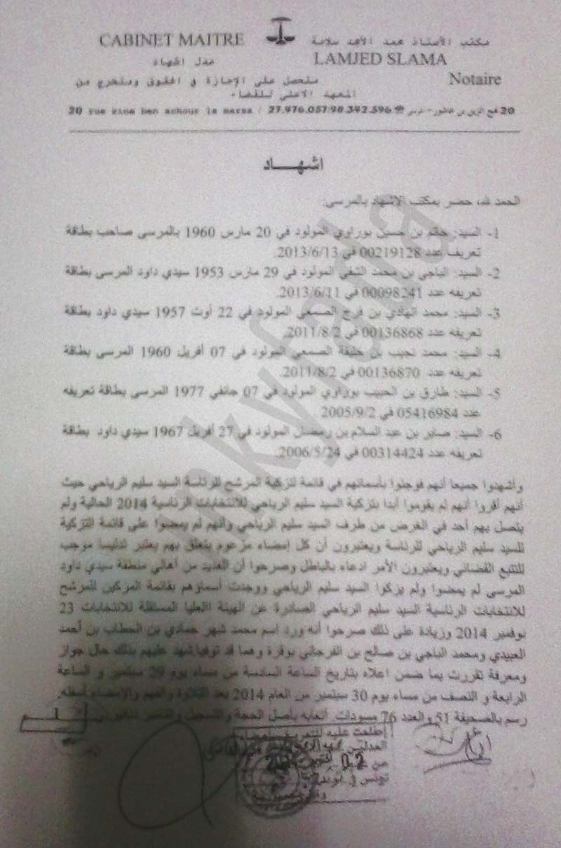 وتثبت معاينة أمّنها عدل اشهاد لحساب جمعية “عتيد” اكتشافَ عدد من متساكني منطقة سيدي داود بالمرسى (الضاحية الشمالية للعاصمة) أنّ أسماءهم تمّ استغلالها لتزكية مرشّح الاتحاد الوطني الحرّ سليم الرياحي دون علمهم أو دون استشارتهم بشكل مباشر أو غير مباشر. ومن المفارقات –وفق محضر المعاينة- أنّ قائمة المزكّين ضمّت، كذلك، عددا من الموتى على غرار (ح . العبيدي) و (م . بن فرجاني) الخ، الى جانب أسماء لمواطنين آخرين لا تتوفّر فيهم شروط التزكية نظرا الى أنّهم من غير المسجّلين في القائمات الانتخابية، وفق ما تثبته معاينات أخرى بحوزتنا، علما أنّ هذه التجاوزات لم تكن حكرا على الرياحي فحسب بل طالت ما لا يقلّ عن تسعة مترشّحين آخرين على غرار مصطفى كمال النابلي ومحمد الفريخة وعبد الرحيم الزواري والباجي قايد السبسي والهاشمي الحامدي ونور الدّين حشّاد وفارس مبروك وعلي الشورابي والصافي سعيد الخ.