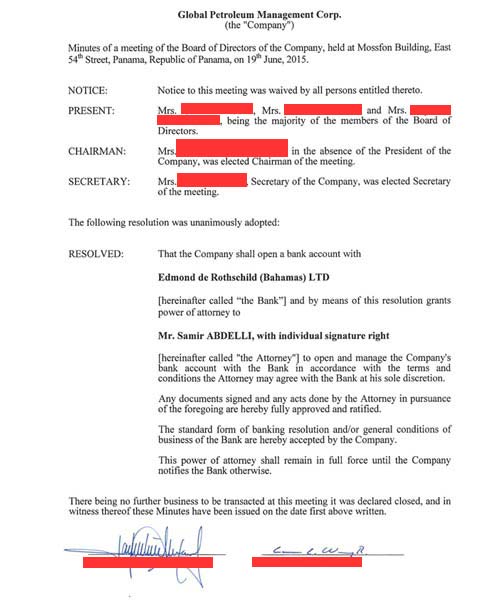 في شهر جوان 2015 أرسلت موظفة في شركة “بدروك غروب موناكو” رسالة إلكترونية تطلب فيها من موساك فونسيكا إصدار قرار “يسمح للحريف ( سمير العبدلي) بفتح حساب في بنك أدموند دي روتشيلد (باهاماس) مع ضمان حقه في التوقيع الفردي.