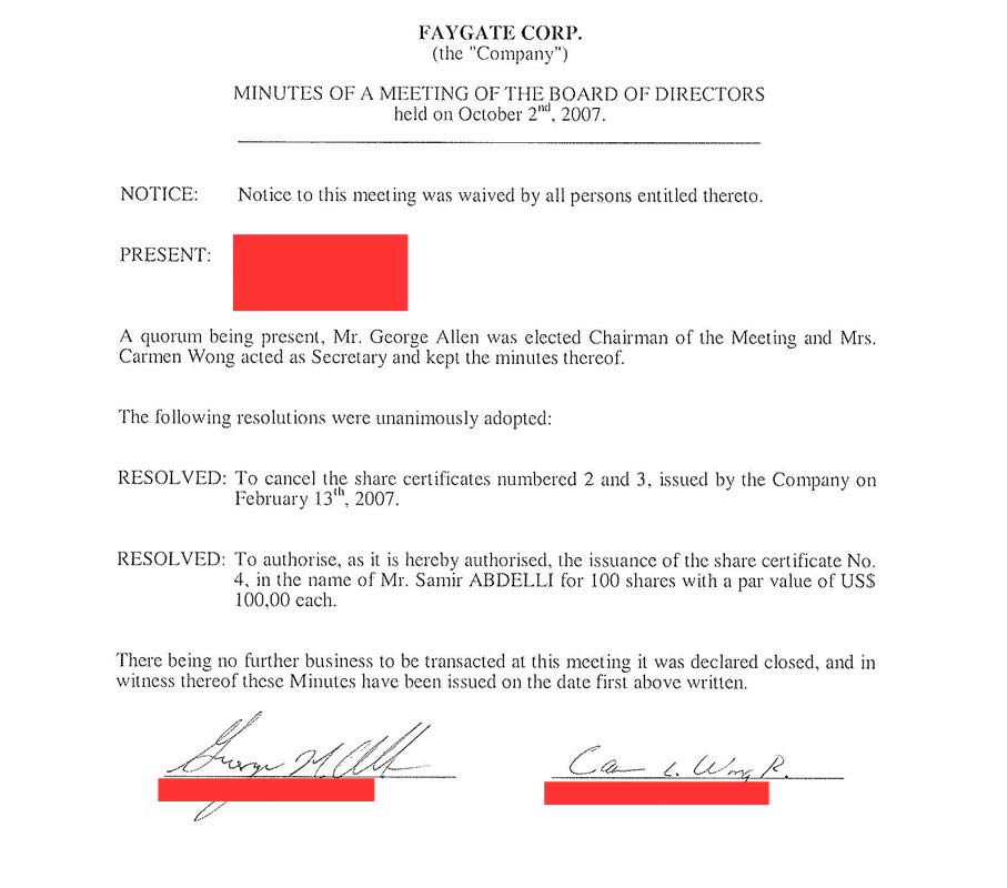 محضر جلسة لاجتماع مجلس ادارة “فيقات كور” لنقل ملكية جميع الأسهم لسمير العبدلي