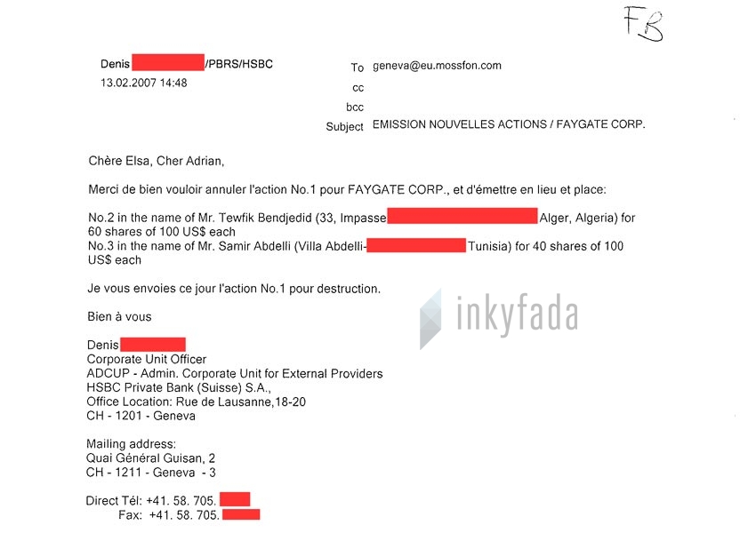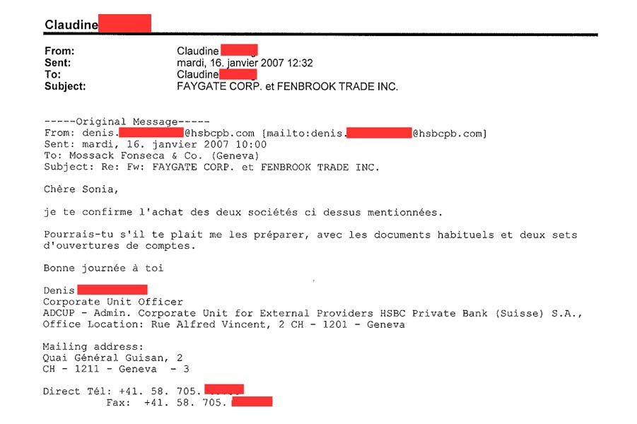 بمجرد أن إتصل سمير العبدلي ببنك HSBC أرسل هذا الأخير رسالة إلكترونية لموساك فونسيكا يشير إلى إحالة التصرف في الشركة للسيد “T” أحد موظفي مكتب الاتثمارات “بدروك” موناكو المتواجد كذلك في لندن و جينيف.