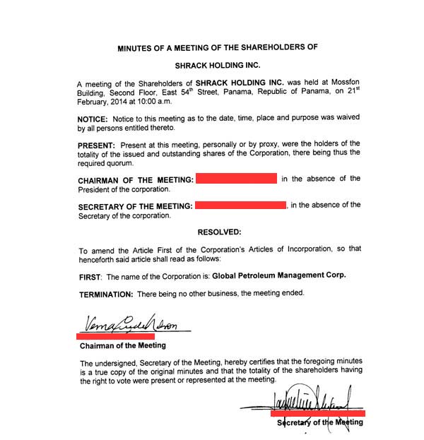 محضر جلسة مجلس الإدارة الذي أقر تغيير إسم شركة “شارك” ليصبح إسمها “قلوبال بتروليوم منجمنت”