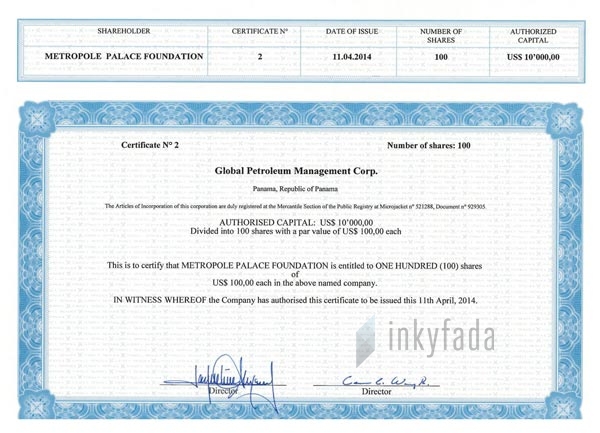 شهادة في إحالة جميع أسهم “قلوبال بترولوم منجمت” لفائدة “متروبول بلاص فوندايشن”