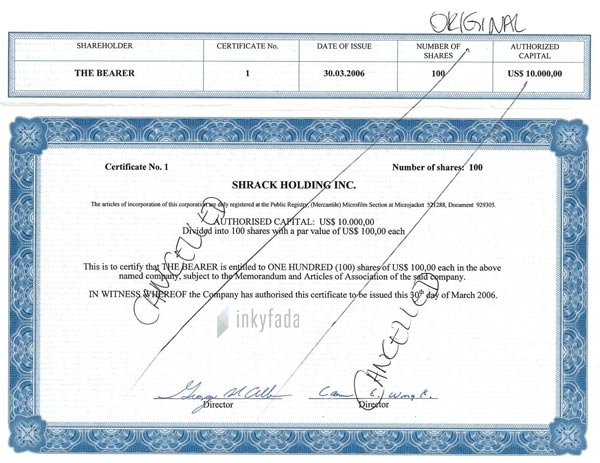 شهادة في ملكية أسهم (لحاملها) في شركة “شاراك هولدنق” تمّ اصدراها بتاريخ 30 مارس 2006