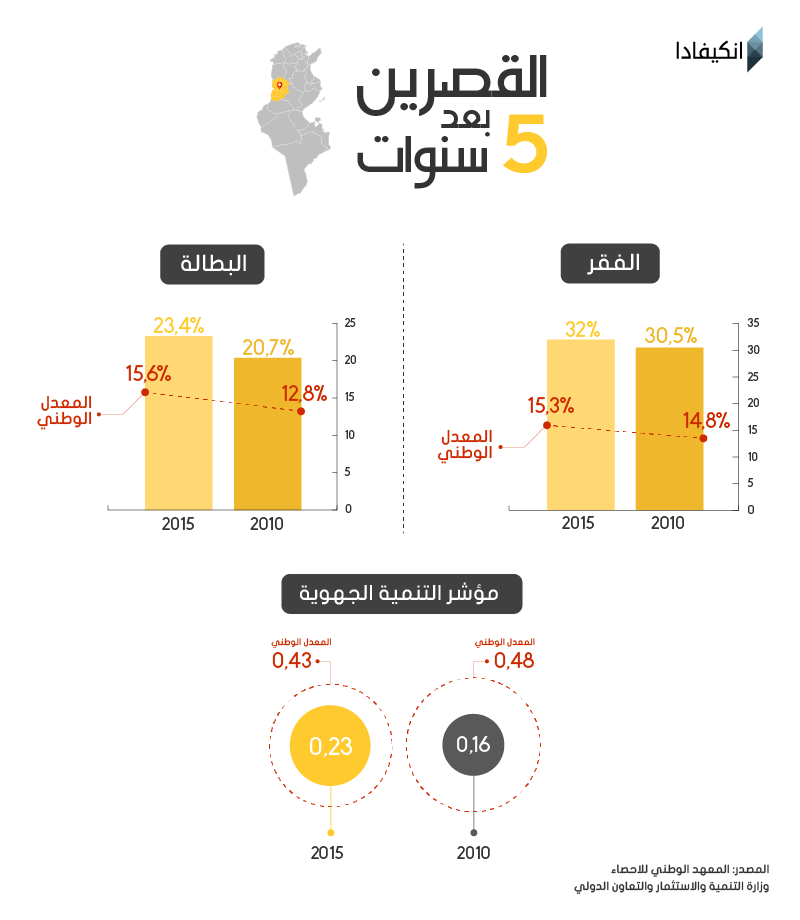 ولاية القصرين، وسط غربي البلاد التونسية، ذات حوالي نصف المليون ساكن، قدّمت أكبر عدد من الشهداء والجرحى خلال الانتفاضة الشعبية التي أطاحت بنظام بن علي، غير أنّها لم تُبارح حالة التهميش والاحتياج بل انّ الوضع الانساني والاجتماعي والأمني زاد سوءً بعد ما يفوق الخمس سنوات عن إطلاق الحزمة الأولى من البرامج التنموية المندمجة التي وعدت بها أولى حكومات ما بعد الثورة وفق ما تؤكده الأرقام المستقاة من مختلف الهياكل الرسمية.