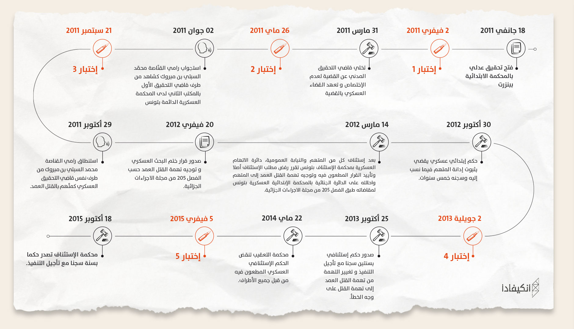 وبالتوازي مع ذلك، ظلّ المتهم بحالة سراح ومباشرا لعمله العسكري إلى حد اللحظة، حتى بعد أن قضت الدائرة الجنائية بالمحكمة الابتدائية العسكرية الدائمة بتونس يوم 30 أكتوبر 2012 ابتدائيا حضوريا بثبوت إدانته، وسجنه من أجل ذلك لمدة خمس سنوات.