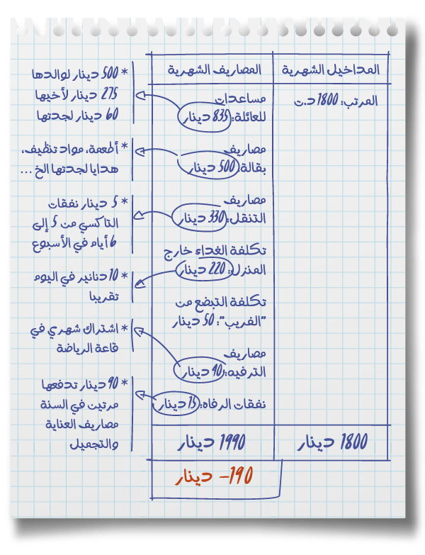 فيما يلي تفاصيل نفقاتها و مداخيلها الشّهريّة :