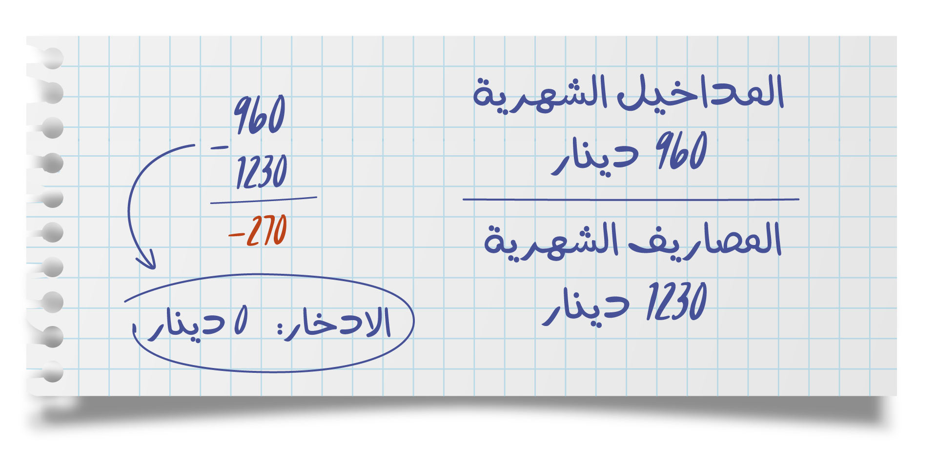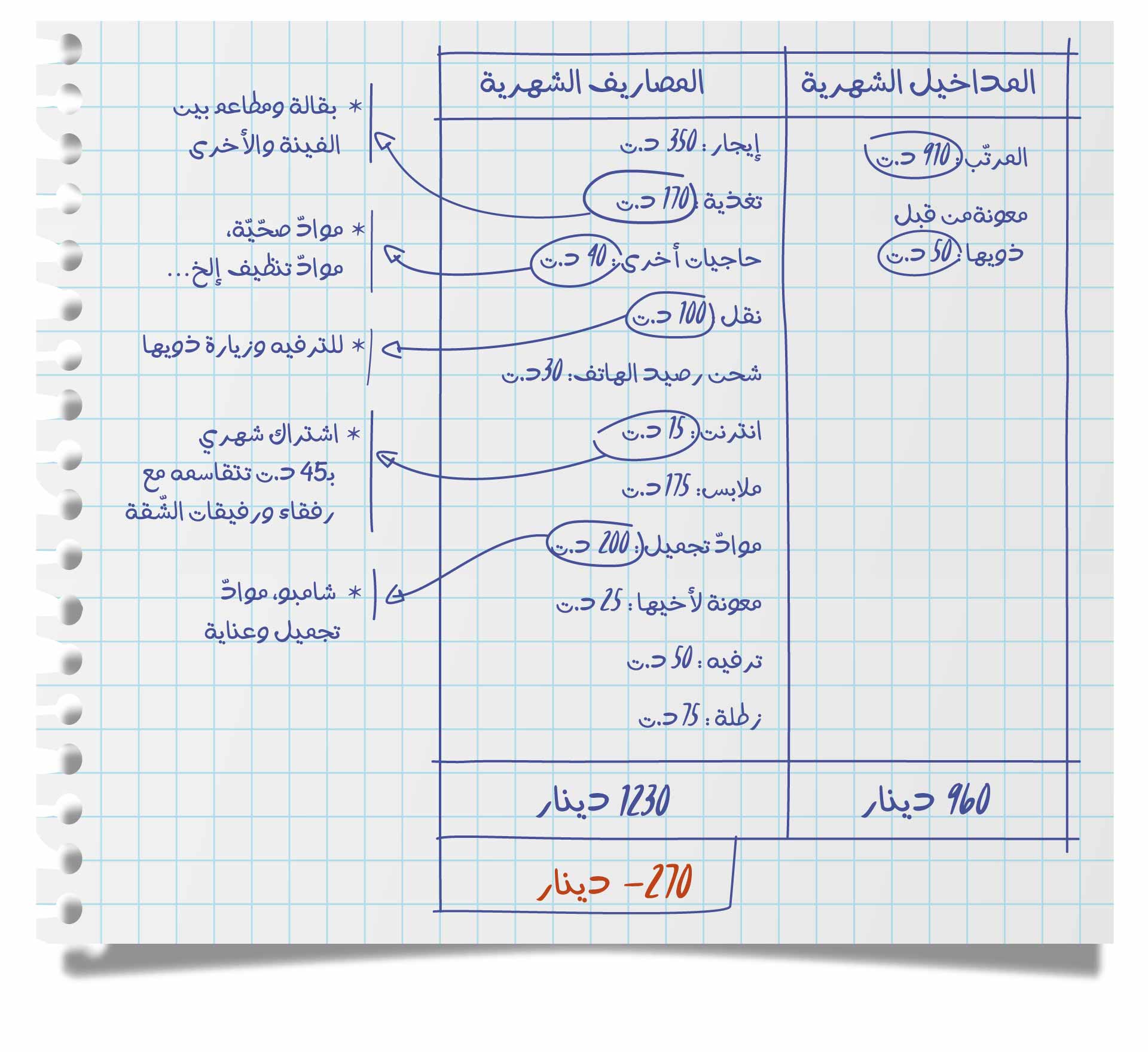 يضاف إلى ذلك 40 ديناراً لموادّ التنظيف والمنتجات الصحية ونحو 30 ديناراً لشحن رصيد الهاتف.