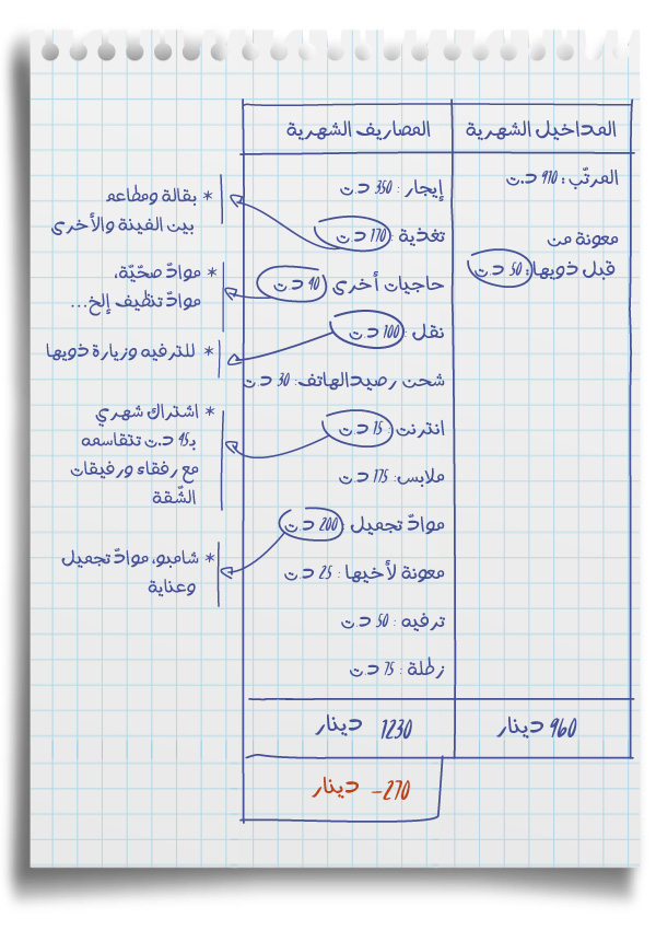 في نهاية الشهر، غالبًا ما يتعين على الشابة سحب المال على المكشوف، أو سحب مبلغ من حساب التوفير الخاص بها والذي يضم حاليًا 1500 دينار. تقول بكلّ براغماتيّة: "لكن في نهاية الشهر، لن يتبقى سوى 1000 دينار". "نهاية الشهر يمكن أن تكون مرهقة. في الأسبوعين الأخيرين، يجب أن أكون أكثر حرصًا ".