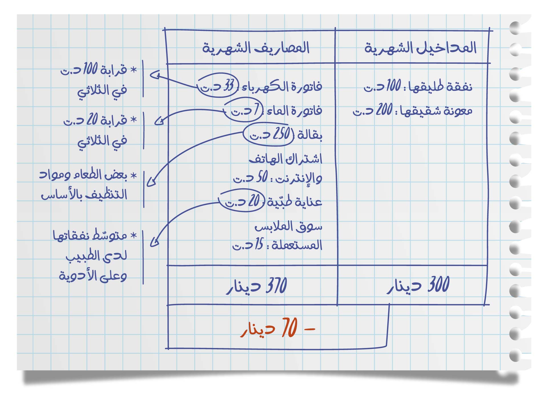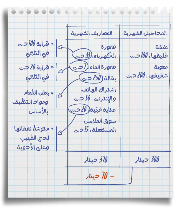 فيما يلي تفاصيل مداخيلها ومصاريفها الشهريّة:
