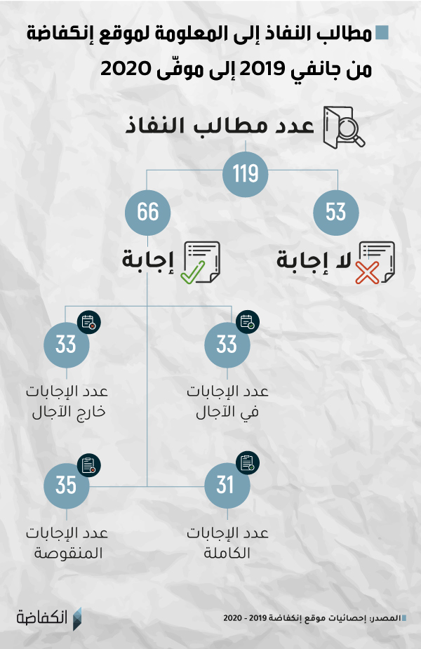 قطعت إنكفاضة شوطا كبيرا في استخدام هذا الحق وآلياته، حيث تقدّم الموقع بـ119 مطلب نفاذ منذ جانفي 2019 وإلى حدود موفّى 2020 لدى العديد من الوزارات والهياكل التي يشملها القانون. إلّا أن هذا الحق لم يلبث أن اصطدم بواقع يحدّ من امتيازاته. ففي 53 مرة من بين مجموع المطالب التي أودعها الموقع، لم نتحصّل على أدنى إجابة أو ردّ يُذكر من الهيكل المعني.