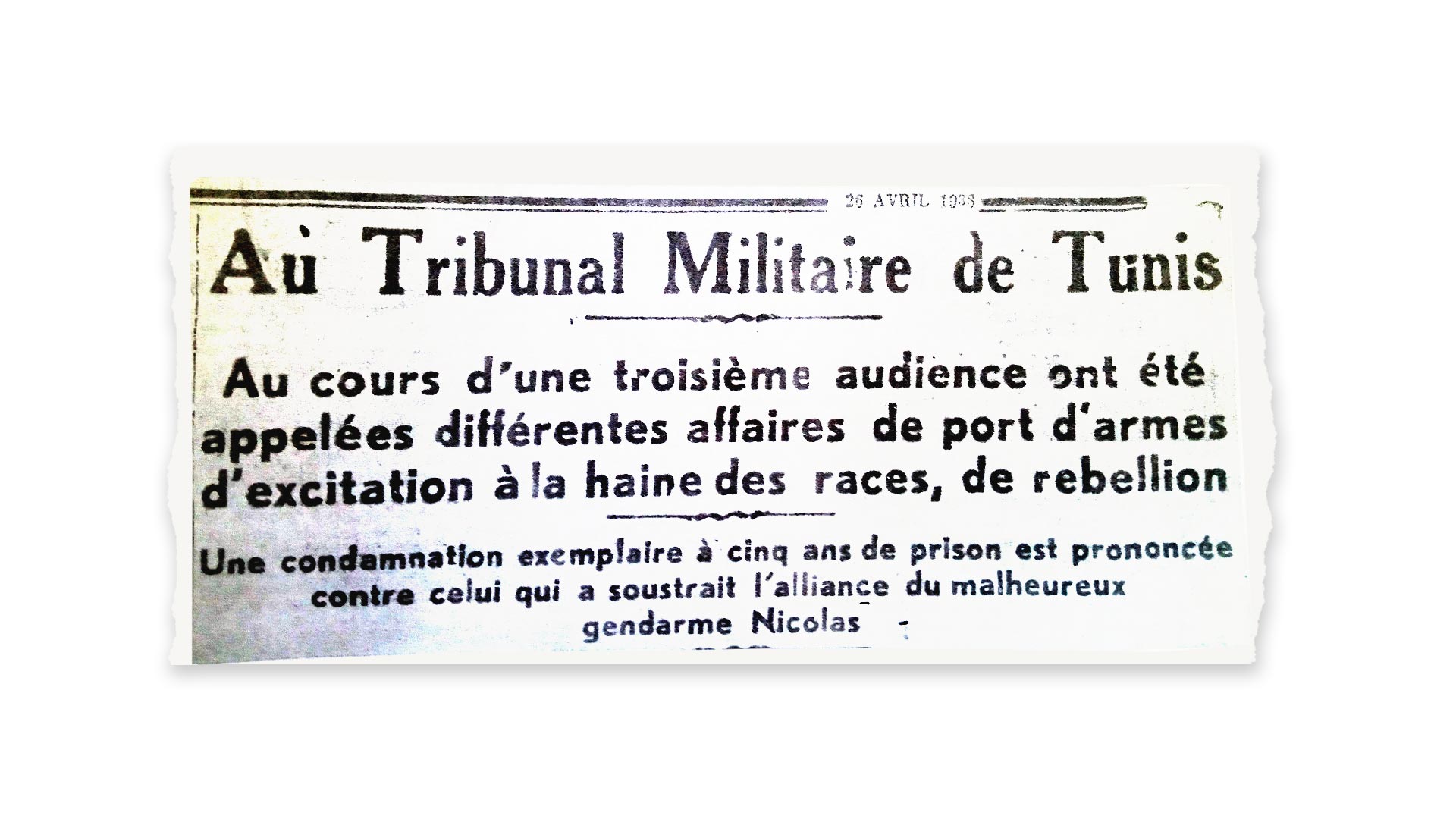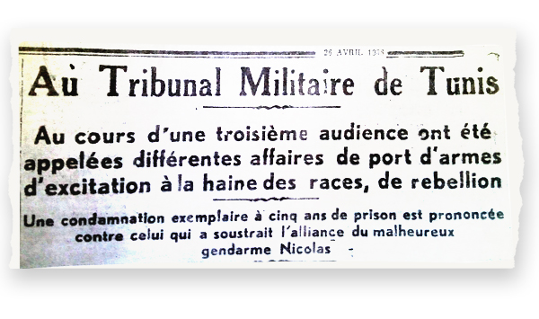 أما الحزب الحر الدستوري الجديد، فقد أُوقفت أنشطته ومُنعت وحداته في جميع أرجاء البلاد بما في ذلك هيكله الأساسي المسمى بـ’العمل التونسي‘. واعتُقل يوم 10 أفريل 13 مناضلا، منهم الحبيب بورقيبة، ثم خضعوا لمحاكمة عسكرية بتهم "التمرد" و"التحريض على الكراهية العنصرية" و"حوز أسلحة ممنوعة" و"إهانة الجيش الفرنسي".
