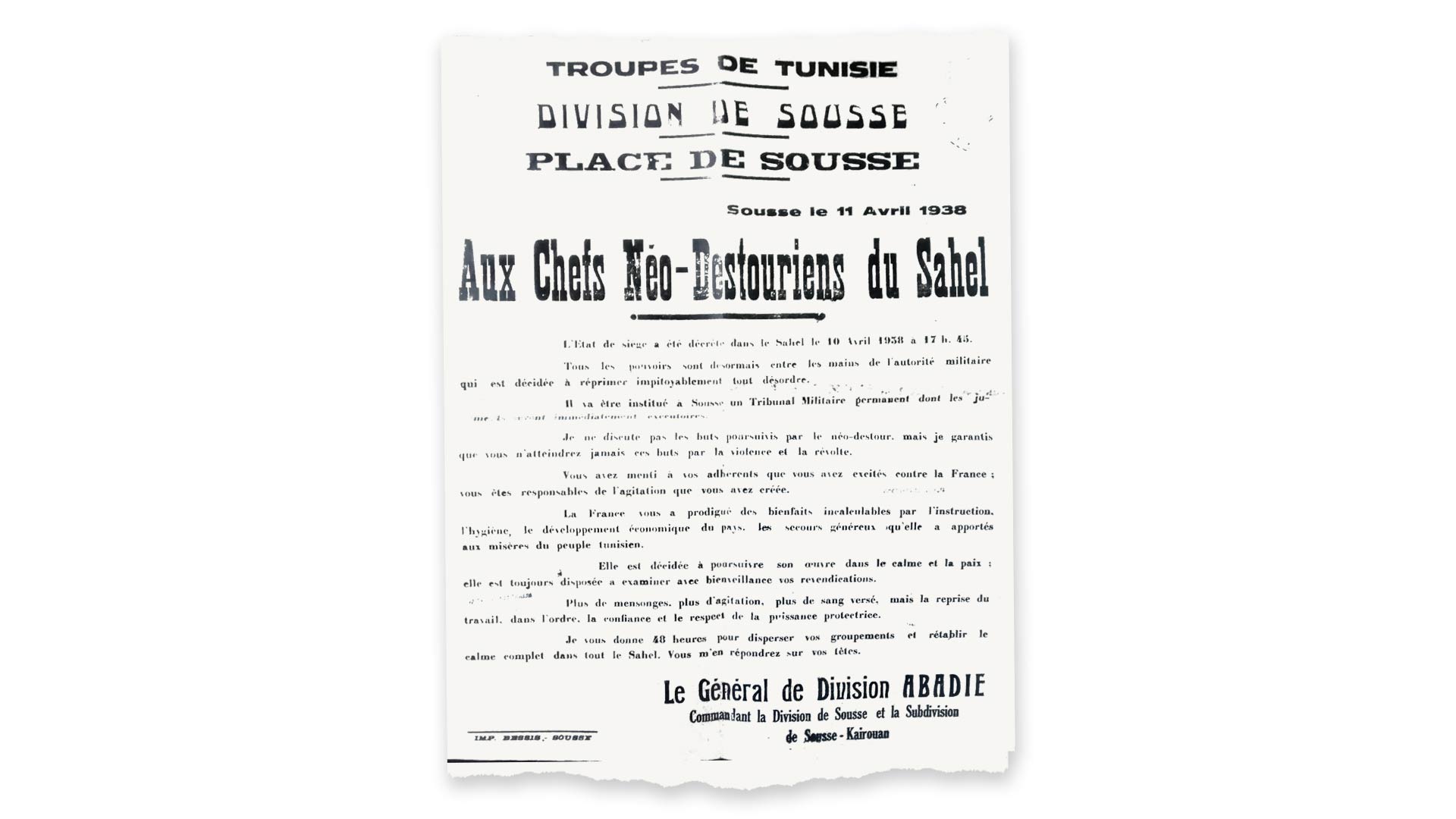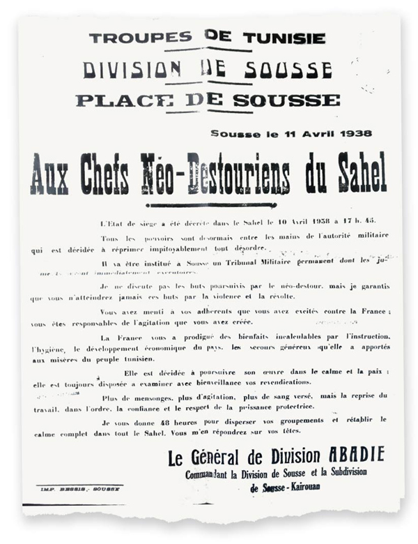 على إثر شراسة القمع الذي مارسه المستعمر خلال أحداث 9 أفريل، جاء المقطع أعلاه ضمن منشور أصدره الدستوريون باللغة الفرنسية للتعبير عن الإحباط أمام استحالة المفاوضات مع قوى الاستعمار. أخذت المقاومة يومئذ منعطفا جديدا في نضالها الوطني ضد المستعمر الفرنسي، واندرج يوم 9 أفريل 1938 في سياق وطني ودولي متوتر، ليُسمىى بعدئذ في التاريخ الرسمي المعاصر باسم "عيد الشهداء".