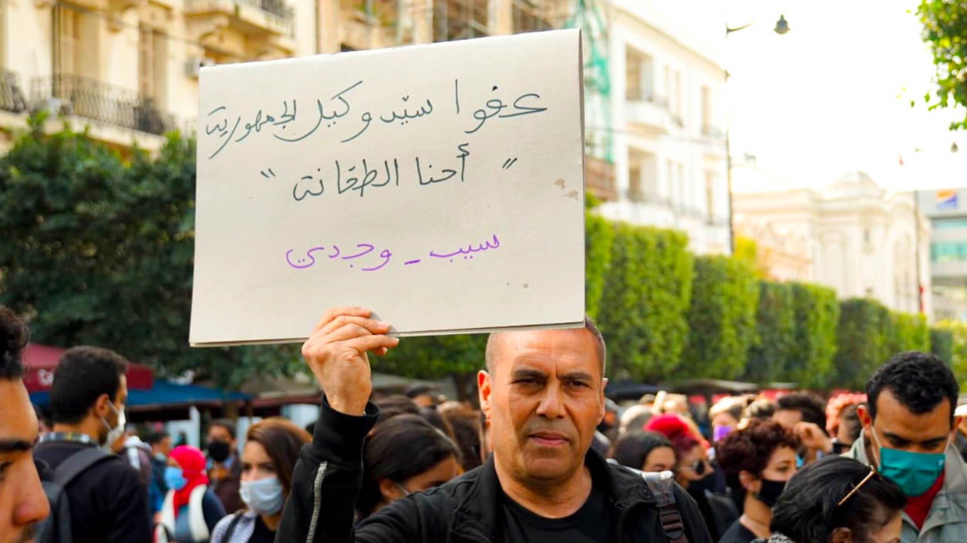 "عفوا سيّد وكيل الجمهورية  'أحنا الطحانة' " لافتة من مسيرة "أطلقوا سراح تونس"  يوم 6 مارس 2021. صورة: عيسي زيادية