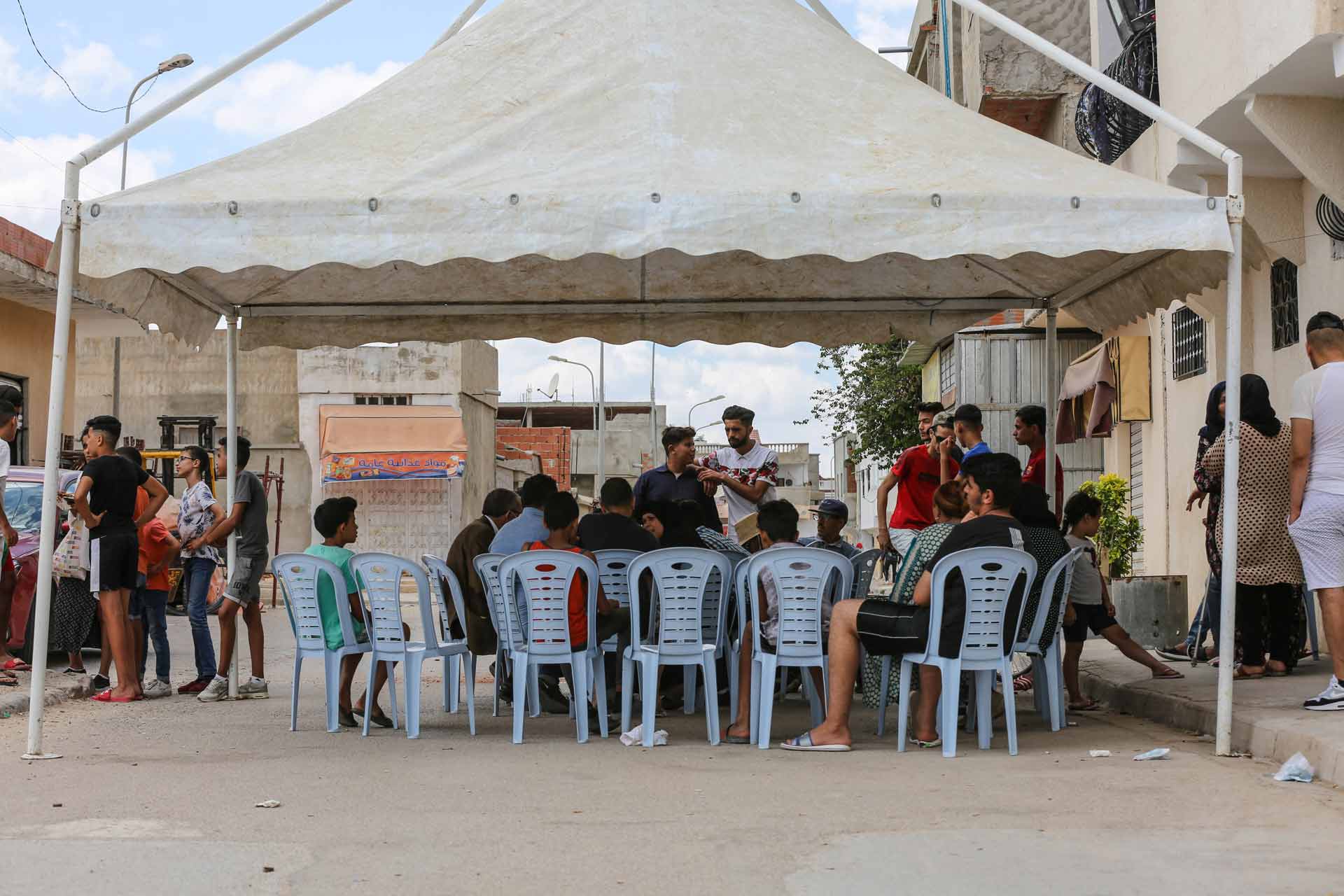 في اليوم الموالي لجنازة أحمد أي في 11 جوان، تنقلت إنكفاضة إلى منزل عائلته. بعد منعطفات متتالية انطلاقا من الشارع الرئيسي في قلب حيّ سيدي حسين السيجومي، وصلنا أخيرا إلى حيث يسكن أحمد. كان المشهد برمتّه يشير إلى مكان عزاء. الأصوات خافتة، الجميع يتكلم همسا بوجوه متجهمة وجباه محمّرة من أشعّة الشمس والحرارة المتصاعدة. ولكن المؤشر الأبرز هي تلك الخيمة الكبيرة البيضاء التي تنصب في الأحياء الشعبية في المآتم كما في الأفراح.