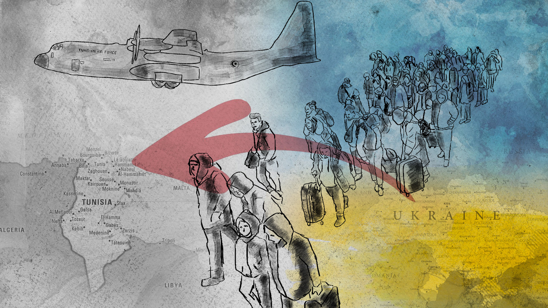 كان يقيم ما لا يقل عن 1500 تونسي وتونسية في أوكرانيا إلى حد اندلاع الحرب لمّا اخترقت الوحدات العسكرية الروسية الحدود الفاصلة بين البلدين وشنت هجوما على البلاد على جبهات متعددة. غُلُّق المجال الجوي الأوكراني في ظل الاقتتال بين جيشيْ الجو ولم يتبق من المنافذ خارج البلد سوى الجبهة الغربية. وفي الأثناء، وجد مئات الآلاف من الأشخاص أنفسهم على مسالك الهروب. تروي إحدى التونسيات الوافدات لإذاعة موزاييك أف أم لدى حلولها بتونس: "طائرات تحوم فوق رؤوسنا وقصف، اضطررنا إلى الهرب إلى الملاجئ ومن ثمّ مغادرتها والمضي في الطريق مرة أخرى، وهكذا دواليك". هربت الشابة من مدينة خاركيف، ثاني مدينة في البلاد، بعد أن دكّتها القذائف الروسية: "حتى عند خروجك منها لا تدري ما قد يعترضك في الطريق، وكذا دام الحال على طول 1400 كم".