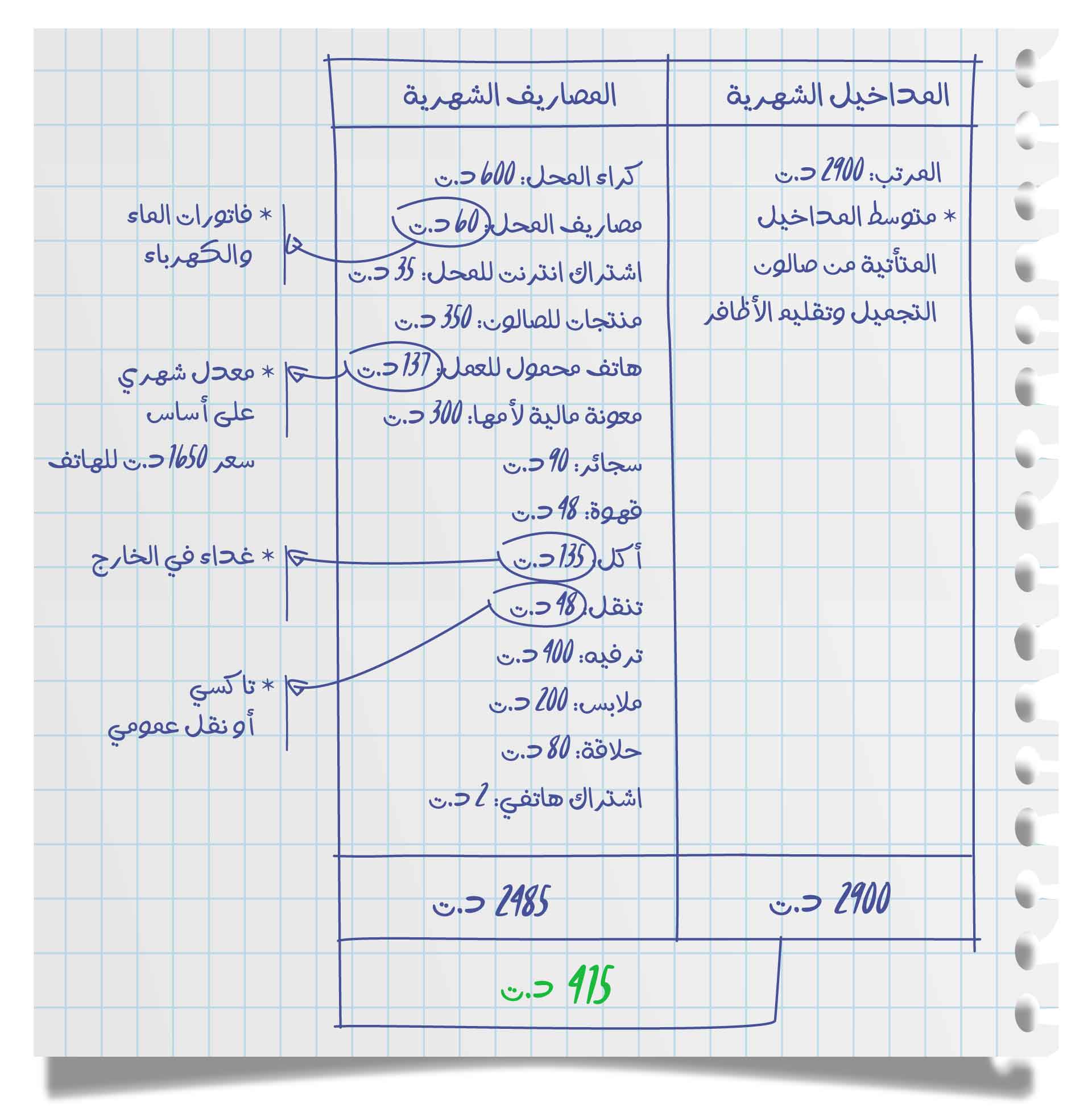 في ما يلي تفاصيل مداخيلها ومصاريفها الشهرية: