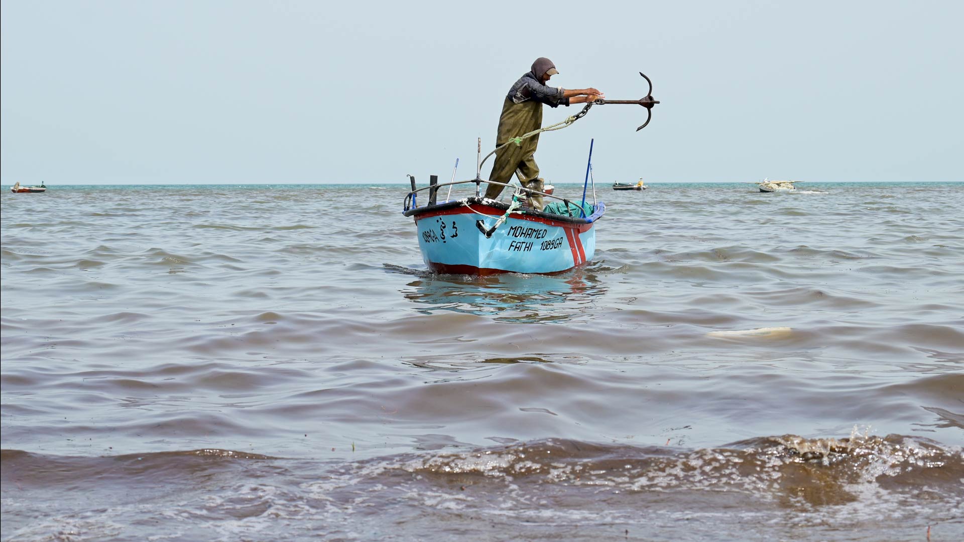 عاد طاقم مركب "فتحية" لتوه إلى ميناء قابس بعد رحلة صيد في عرض البحر أين شاهدوا بقع بترول ناجمة عن غرق السفينة. "نحن سعداء بما اصطدناه اليوم، ولكن عملنا عموما هو عمل شاق للغاية"، الواعر، صياد. قابس، 21 أفريل 2022. عدسة: مورغان فيرتز / هانز لوكاس.