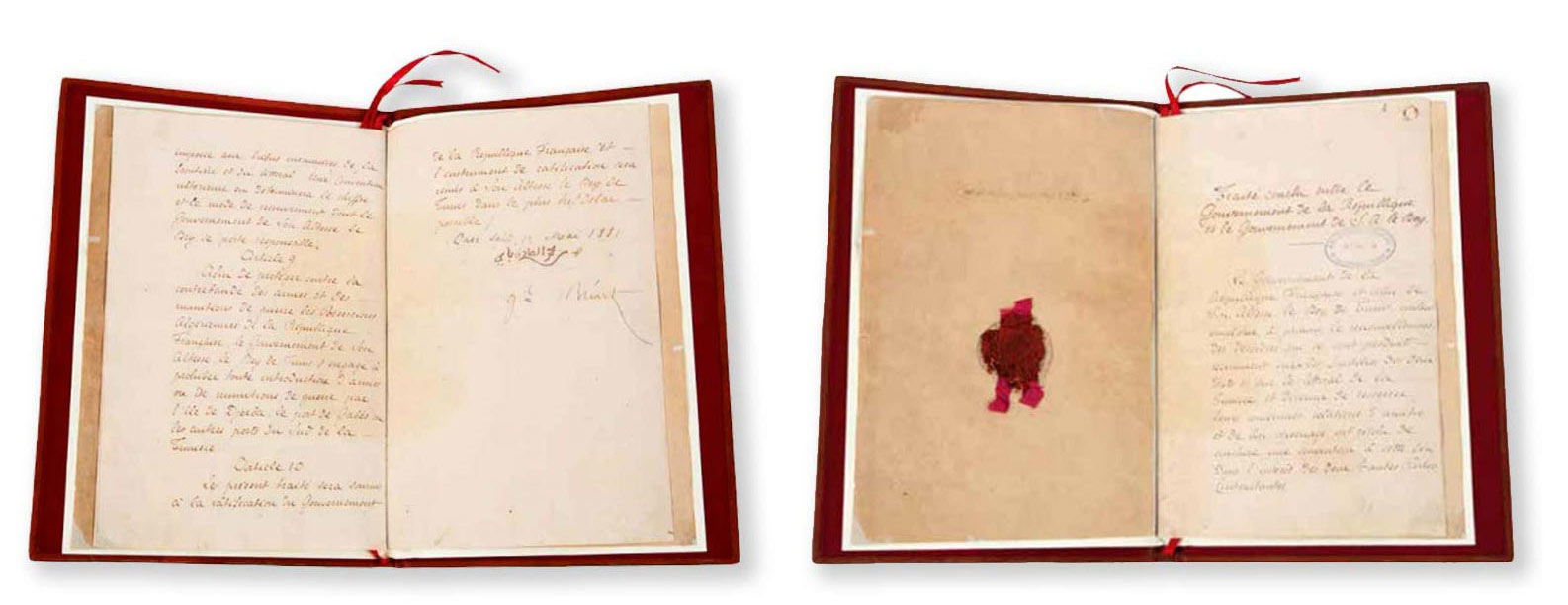 رضوخا لوطأة الإكراه العسكري وآراء مستشاريه، وقع الصادق باي على المعاهدة مع حوالي الساعة السابعة مساءً. وقد حملت المعاهدة أربعة إمضاءات أولها للباي وثانيها لوزيره الأكبر مصطفى بن إسماعيل والثالث للقنصل روسطان وإمضاء رابع للجنرال بريار. ولعل الرسم أسفله الذي أنجزه الرسام التونسي أحمد عصمان قد خلّد بحق هذه اللحظة.