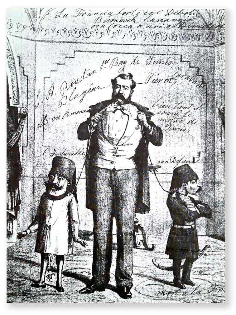 هذا الرسم المنشور في صحيفة "ليبوكا" الإيطالية والذي يظهر القنصل روسطان ماسكا عِقال جسدين مصغّرين للصادق باي (على اليسار) ووزيره مصطفى بن إسماعيل (على اليمين)، يعكس بشكل واضح جوانب القهر والتقزيم وحَيْوَنَة الإنسان في المشروع الاستعماري.