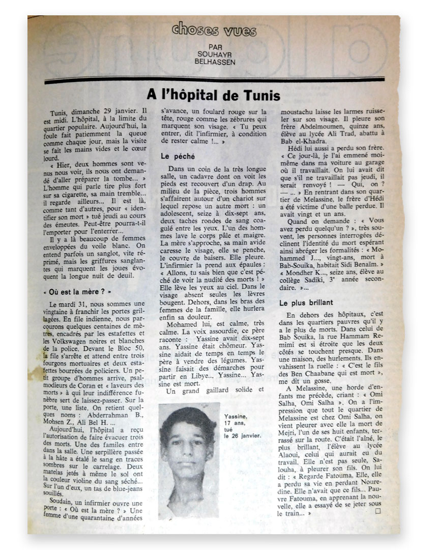 أخذت العائلات تبحث عن موتاها داخل هذه المدينة المحاصرة. في هذا المقال الصادر يوم 15 فيفري 1978 في مجلة جون أفريك، تفصل سهير بلحسن تجارب أقارب الضحايا الشباب، وتصف مشاهد مفجعة في المستشفى رأت فيها عائلات موجوعة وأرضية ملطخة بدماء الضحايا "مُرّرت عليها ممسحة على عجل [...] فزاد انتشارها على البلاط في بقع داكنة".