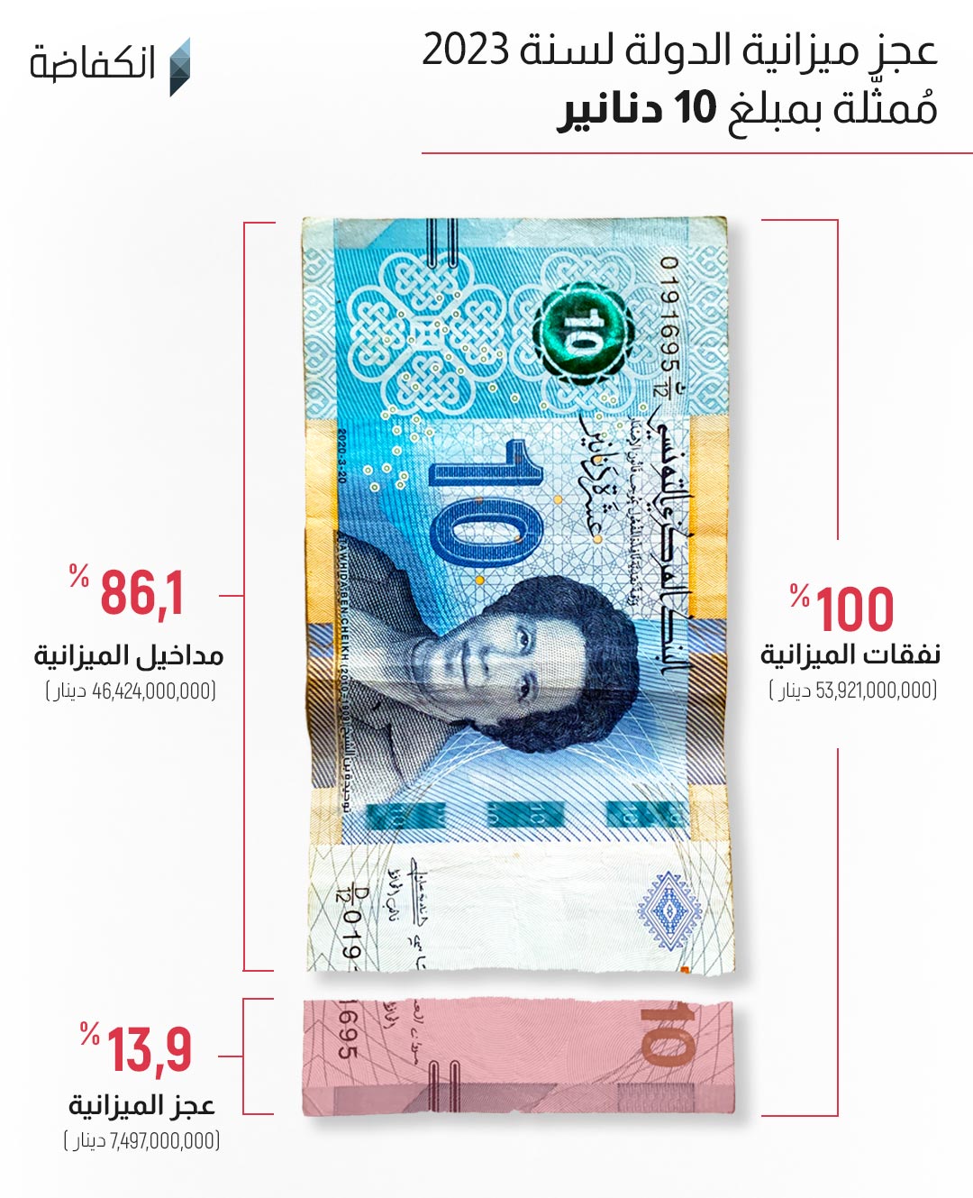 يبين توزيع نفقات ميزانية الدولة أن مبلغا كبيرا يُخصص لخدمة الديون، أي جميع التكاليف المتعلقة بالحصول على القروض وسدادها. ومن أصل 100 دينار من الميزانية، تنفق الدولة 9.8 دينار على السداد مقابل 8.7 دينار فقط على الاستثمارات الجديدة.