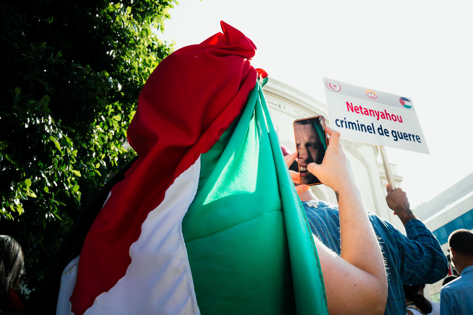 كثيرا ما تلوح الكافيّة، رمز القضيّة الفلسطينيّة الأزلي، في المظاهرات، بما في ذلك المسيرة الأولى المنظّمة أمام المسرح البلدي تضامنا مع غزّة.