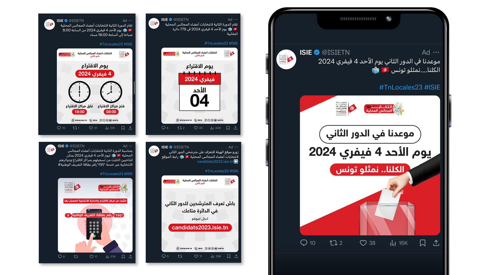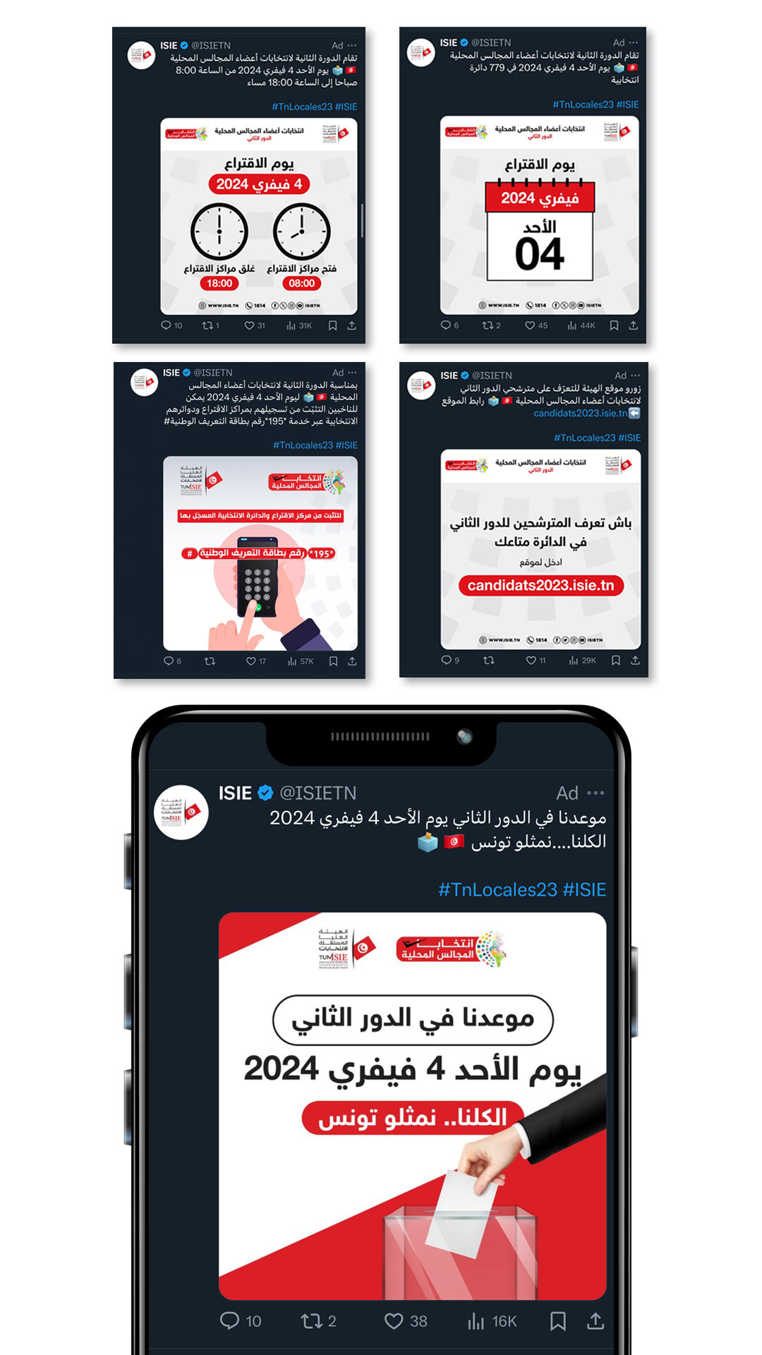 بالتزامن مع ذلك، أطلت هيئة الانتخابات على الشبكات الاجتماعية بتغريدات إعلانية خلال الفترة الممتدة بين الدوريْن. "بعد الانتخابات التشريعية، اختارت اللجنة الابتعاد عن وسائل الاتصال التقليدية والتركيز على الرقمية" يقرّ الواعر، مضيفا أن الحملة استهدفت "الشباب بشكل رئيسي".