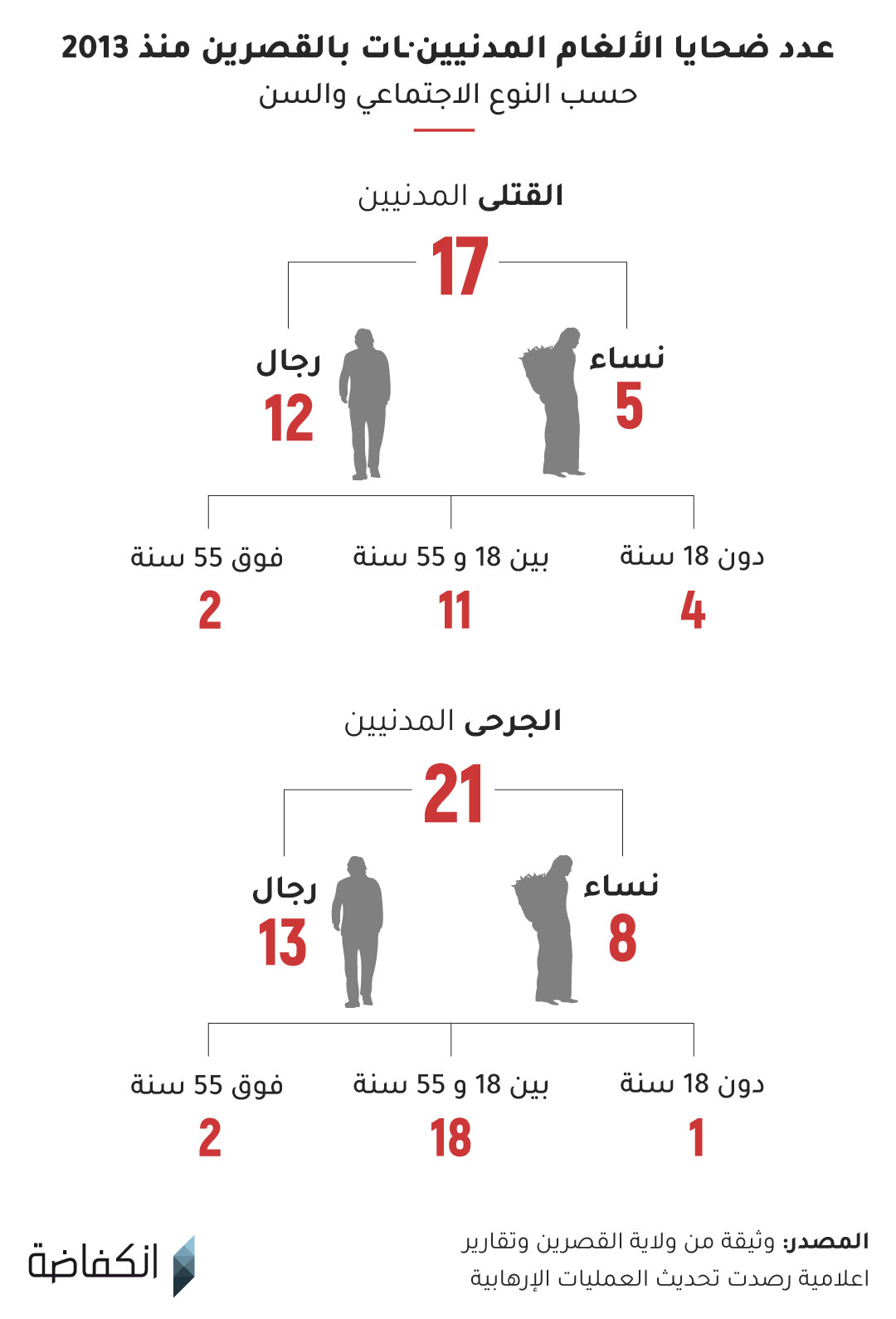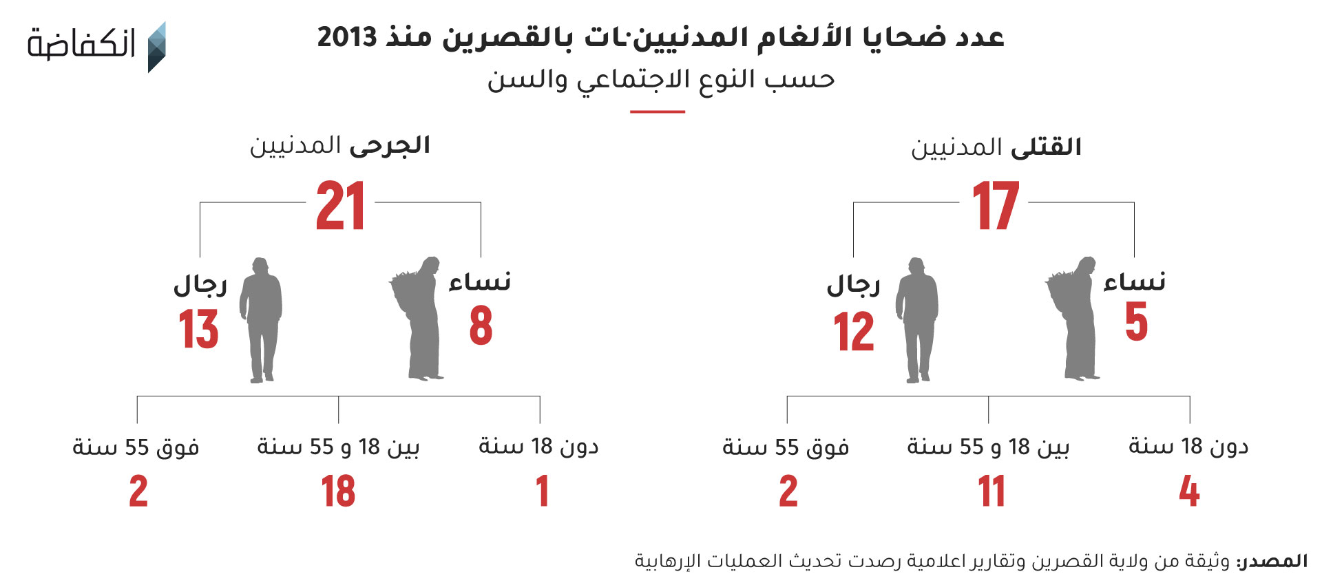 يستند الرسم البياني أعلاه إلى قائمة اسمية تحصلت عليها انكفاضة من ولاية القصرين، إضافة إلى عدد من الضحايا لم يُذكروا في الوثيقة الرسمية قامت إنكفاضة بجردهم، دون احتساب القتلى والقتيلات والجرحى من العسكريين، والمدنيين·ـات القاطنين·ـات في المناطق التابعة إداريا إلى ولاية سيدي بوزيد (جزء من جبل مغيلة).
