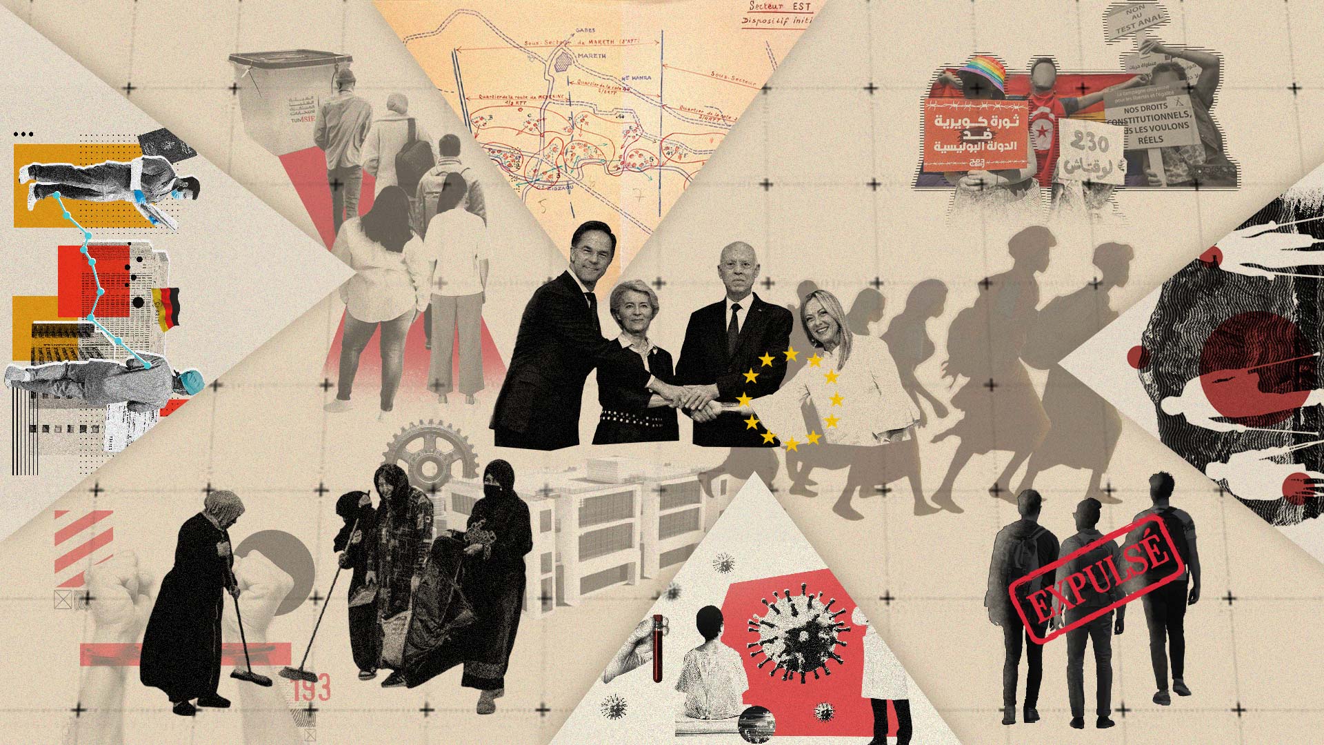 كما سلطت بعض الإنتاجات الأخرى الضوء على الصعوبات التي يلاقيها التونسيون·ـات في الخارج، بما في ذلك العوائق ووضعيات التحيّل التي يواجهها الممرضون.·ـات التونسيون·ـات على طريق العمل في ألمانيا، وتواطؤ شركات الطيران في طرد التونسيين من إيطاليا، فضلاً عن ظروف