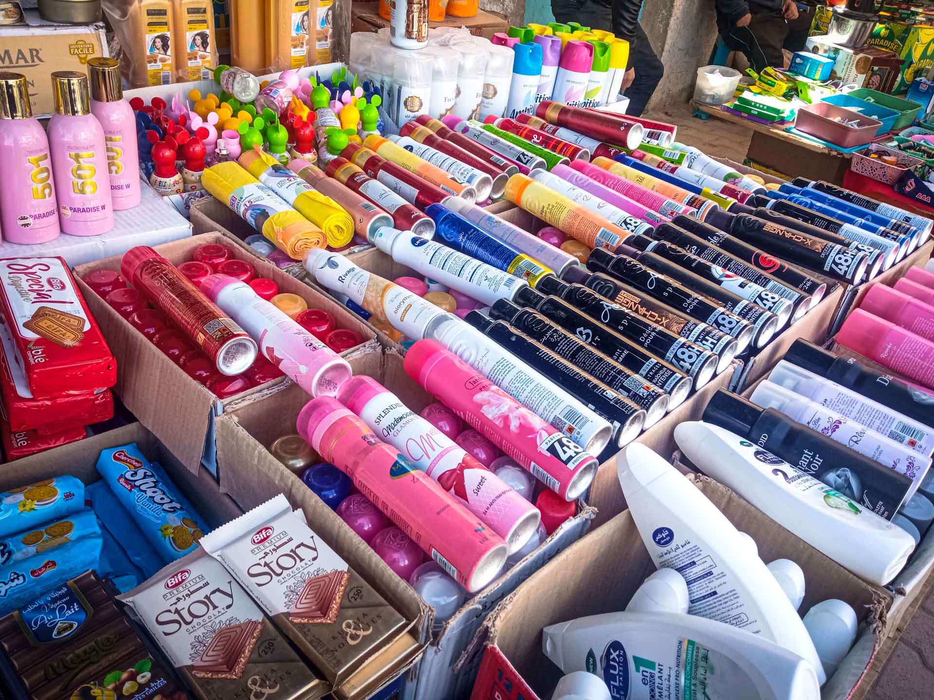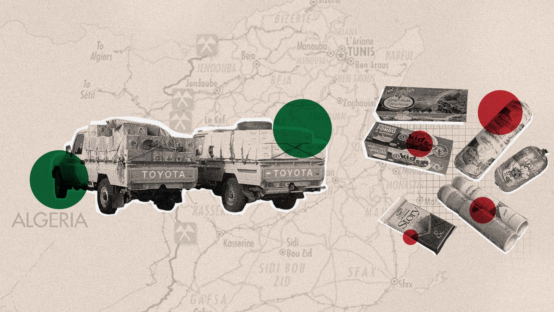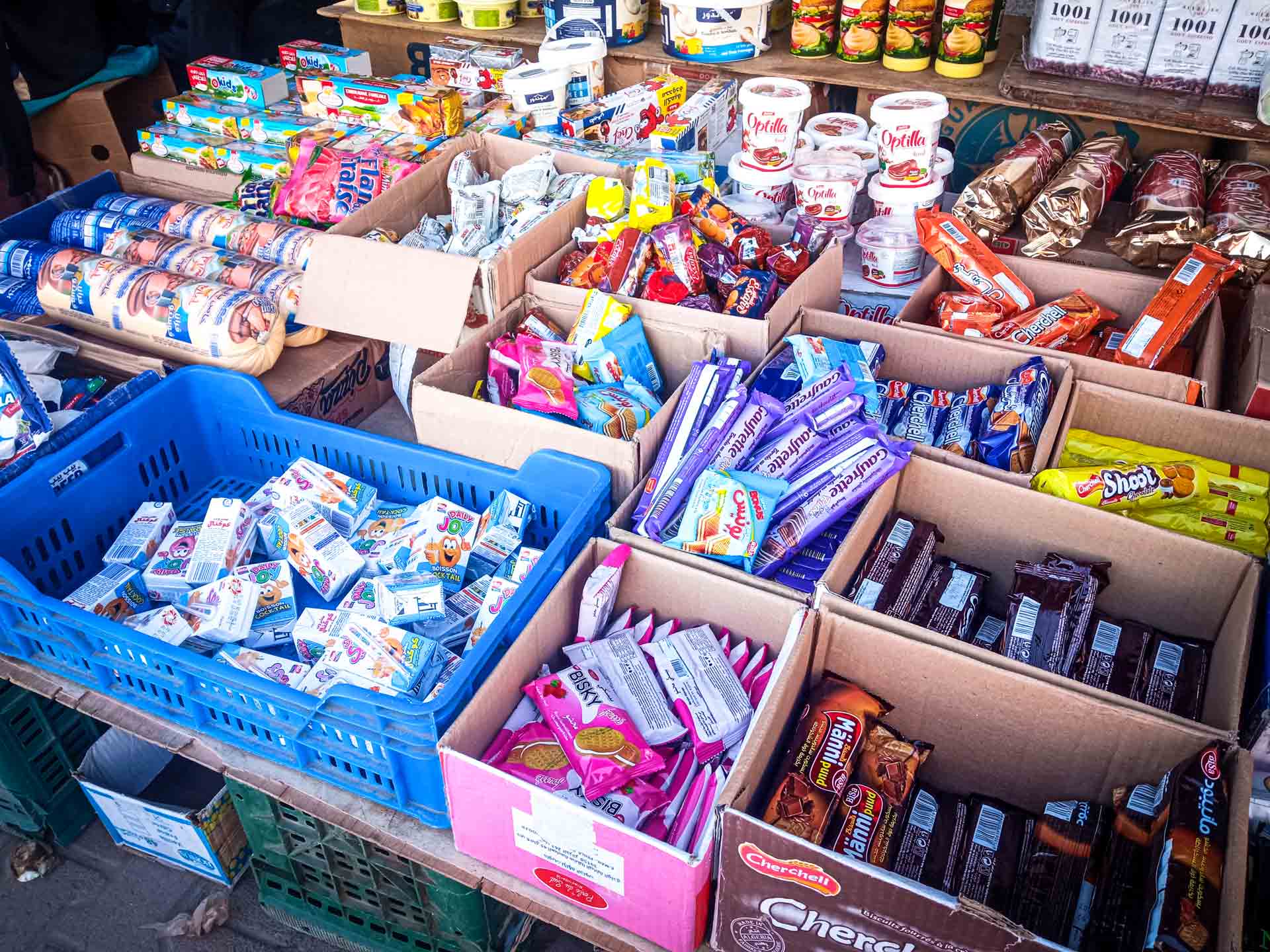 جبن الموزاريلا، العصير، الياغورت، المشروبات الغازية، الزيت، السكر، القهوة، التّن، الشوكولاتة، الأرز والحلويات ومختلف أنواع العصائر، كلها معروضة على "نصبات" في الشوارع والطرقات والأرصفة والمحلات وفي بعض المساحات التجارية وتحت أسوار الإدارات. السلع الجزائرية على اختلافها منتشرة في كل مكان، في هذه الجهة على الحدود مع الجزائر.