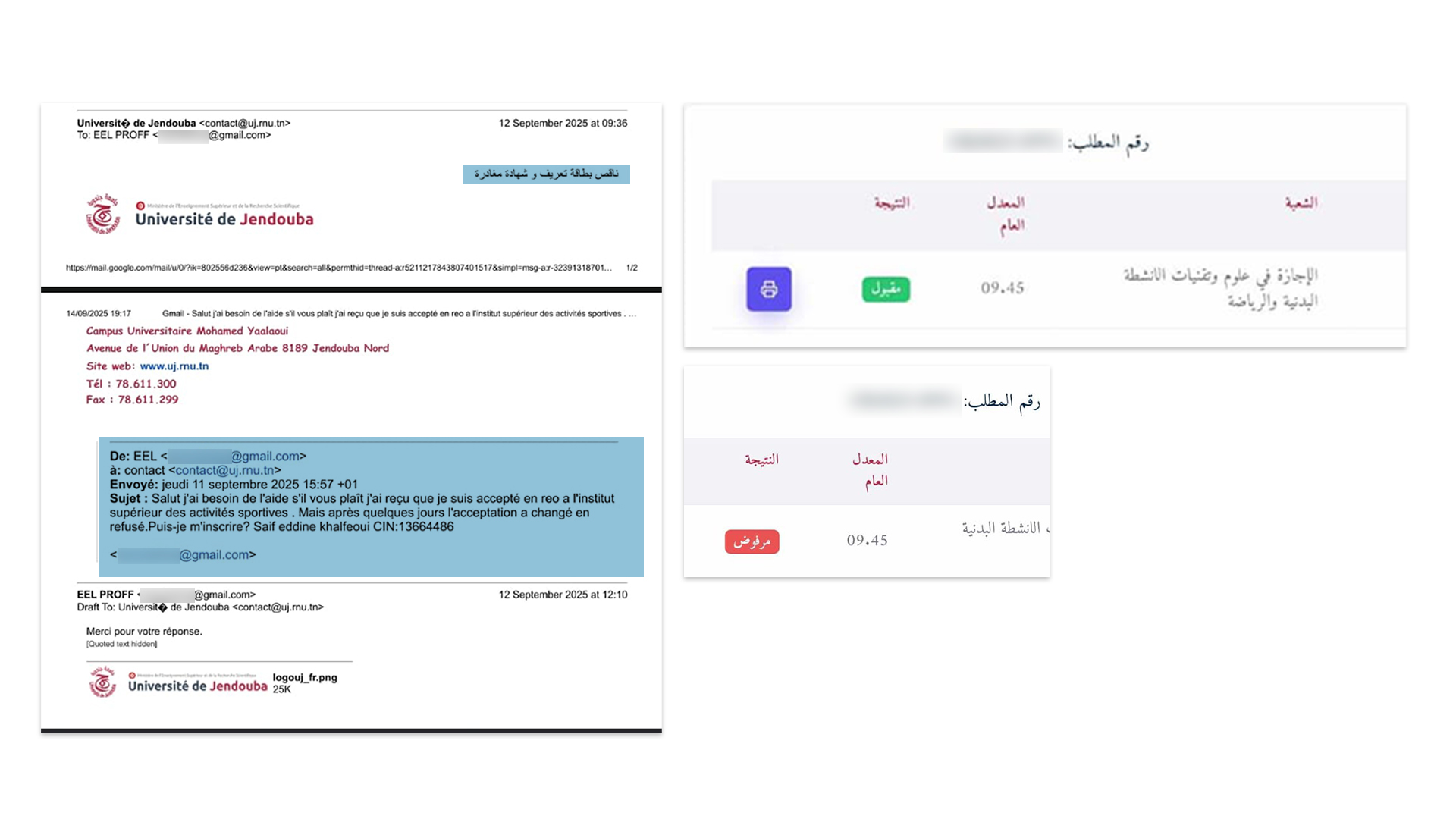 "لا أدري حقًا ما هو مصيري اليوم وإلى أين أتوجه … لقد اجتزت اختبار إعادة التوجيه الجامعي لدورة مارس بنجاح للالتحاق بالمعهد العالي للرياضة والتربية البدنية بالكاف، وتلقيت إشعار قبولي النهائي على موقع جامعة جندوبة، إلا أنّي فوجئت بعد أيام بتغيير نتيجة مناظرة من مقبول إلى مرفوض، دون أي توضيح لأسباب هذا التغيير. فأصبح مستقبلي الدراسي اليوم رهينة تساؤلات مستمرة حول مسار تعليمي الجامعي·"