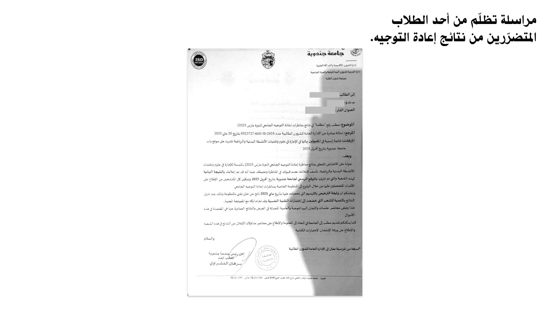 تقول آمنة (اسم مستعار) وهي إحدى المتضررات من نتائج إعادة التوجيه: "اتصلت بجامعة جندوبة للاستفسار عن بقية إجراءات الترسيم بعد نجاحي في اختبار إعادة التوجيه، فأكد لي أحد الإداريين عبر الهاتف أن الإشعار الذي تلقيته على موقع الجامعة بـ'مقبول' يُمثّل النتيجة النهائية. غير أنّه، وبعد أن توصلت مع زميلته لاستكمال الإجراءات وأخذ بياناتي الشخصية، فوجئت بالموظفة تخبرني بأنني 'مرفوضة' وأن ما حصل ناجم عن خطأ في النظام المعلوماتي للجامعة، قبل أن تُنهي المكالمة بشكل مفاجئ. ورغم محاولاتي المتكرّرة لإعادة الاتصال، لم أتمكّن من الوصول إلى أي مسؤول".