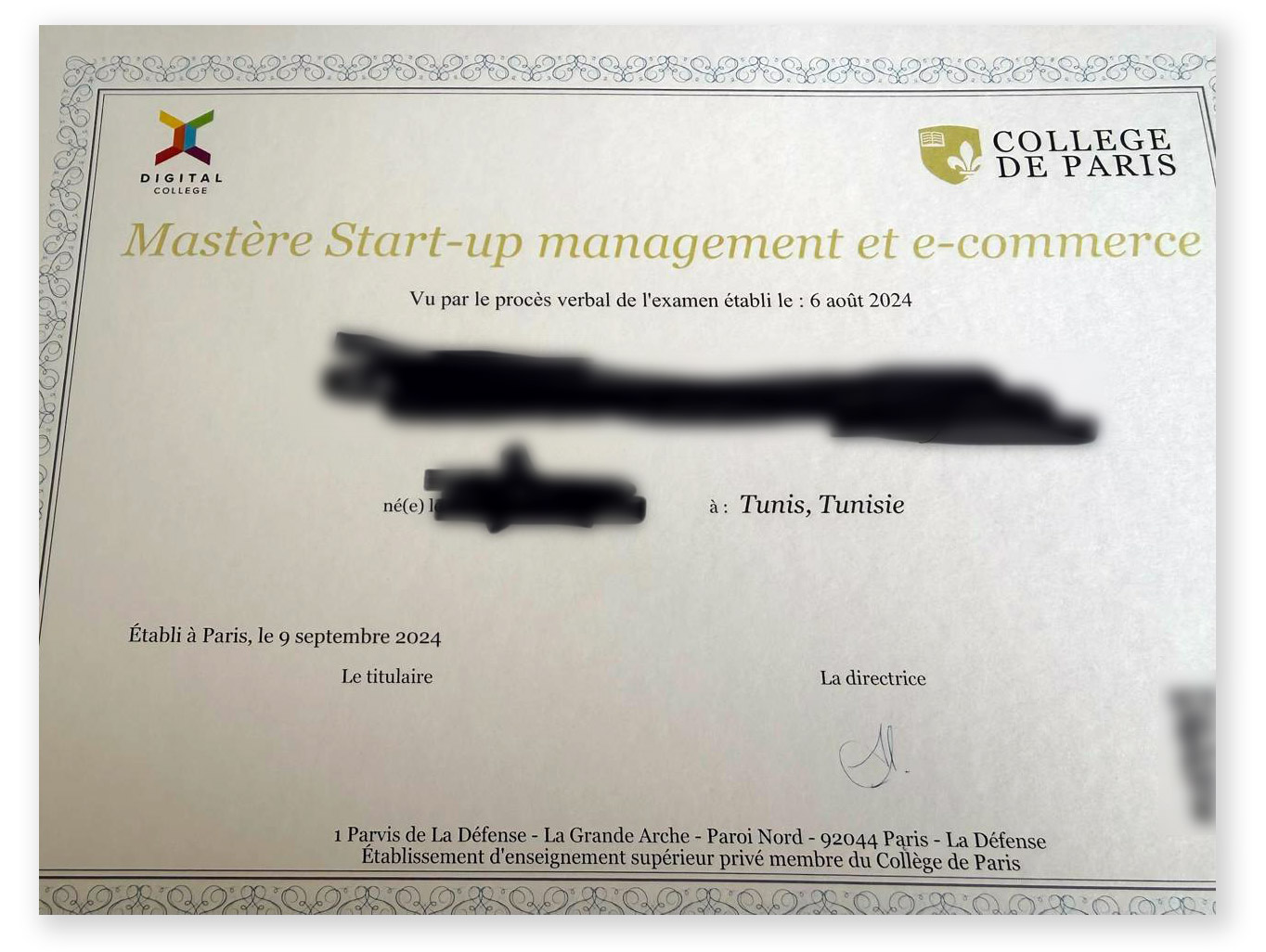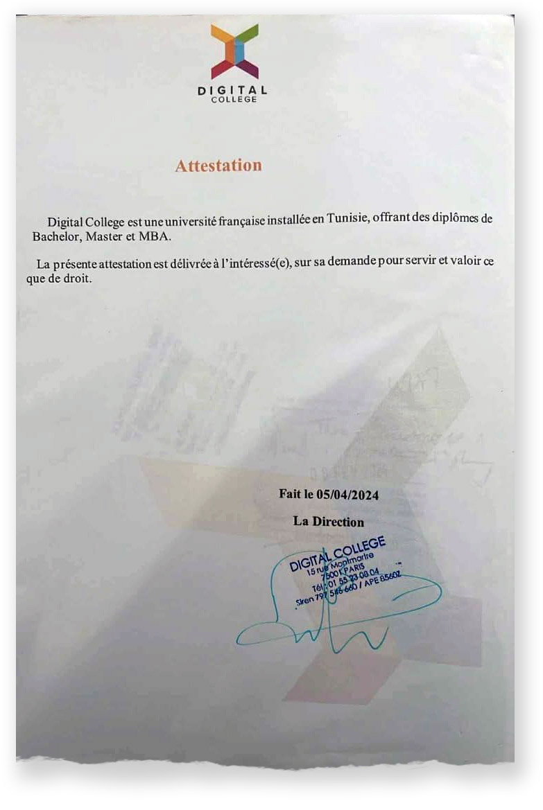 شهادة ماجستار موقعة من طرف مديرة College de Paris موضحة شراكتها مع Digital College