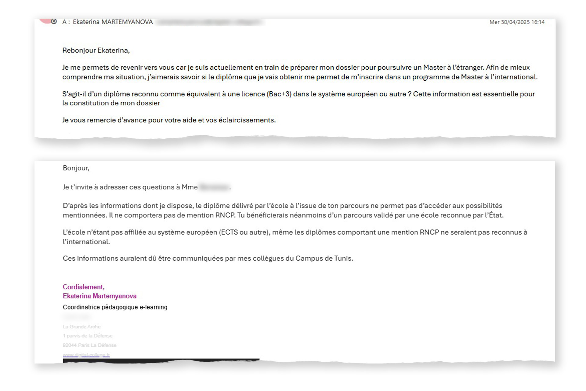 بمرور الوقت، بدأت تظهر تساؤلات بين بعض للطلبة·ات "المتخرجين·ات" والراغبين·ات في مواصلة الماجستير بالخارج. تفيد إحدى الوليات إن عددا من هؤلاء الطلبة تواصلوا مع collège de Paris للاستفسار عن إمكانية متابعة دراسة مرحلة الماجستير هناك، لكن الرد الذي تلقوه كان صادما.