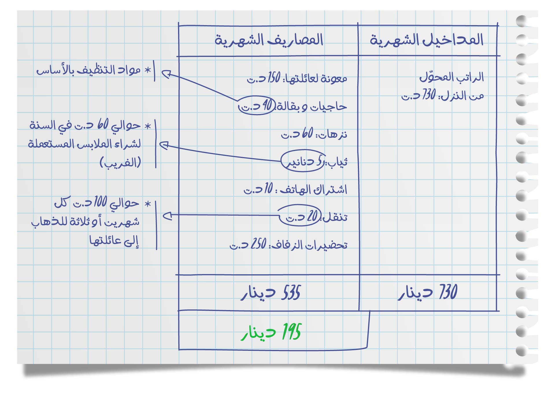 فيما يلي تفاصيل نفقاتها و مداخيلها الشّهريّة :