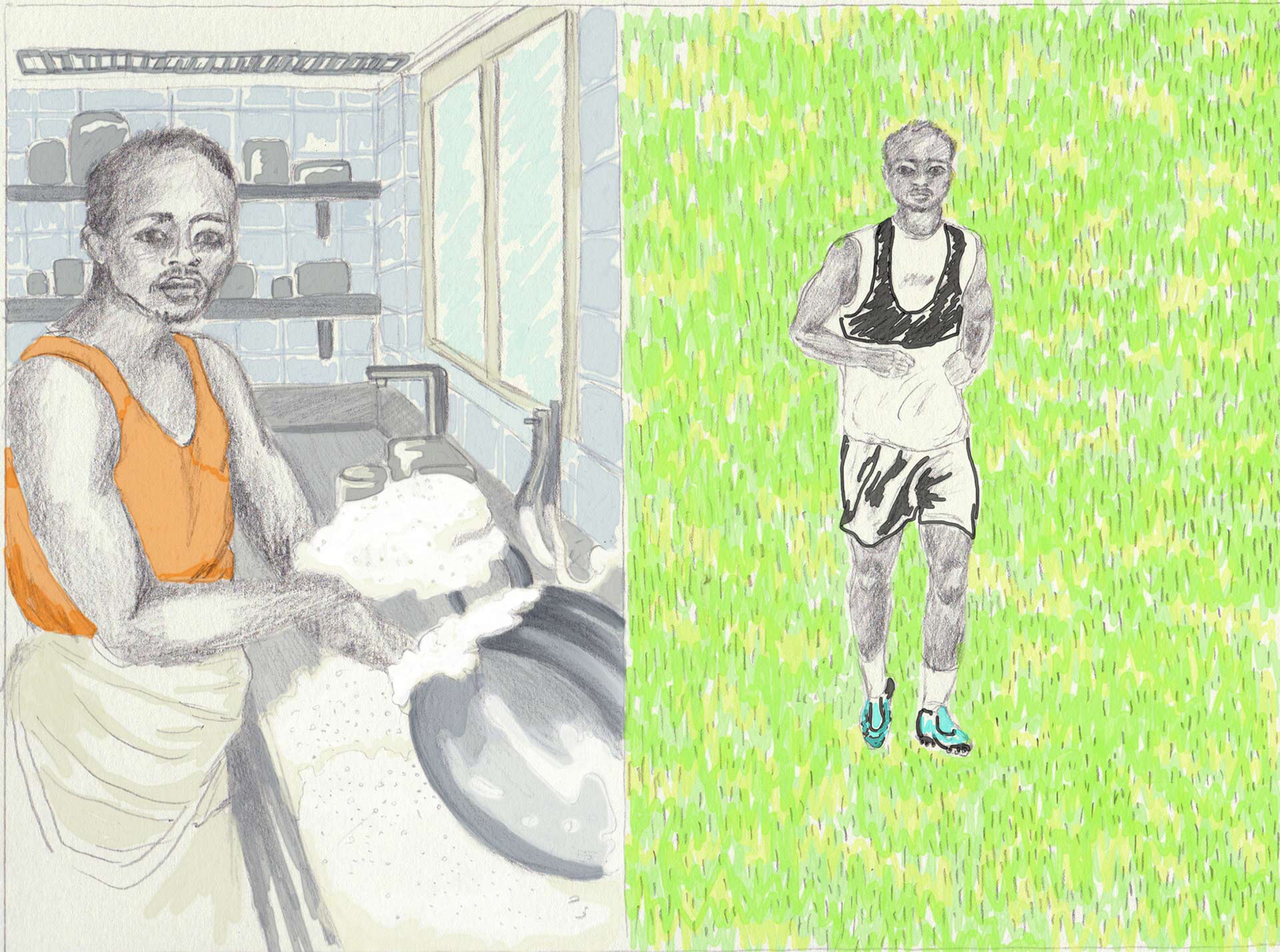 كان مامادو، وعلى مدار الأسبوع، يصل عمله على السّاعة الخامسة والنصف صباحًا ليفتح المبنى ثمّ يغادر مكتبه على السّاعة السّادسة والنّصف صباحًا للتدرّب لسويعة قبل أن يـ·تصل الموظّفون·ـات ويلاحظوا أو يلاحظن غيابه. وفي المساء، كان ينتقل إلى عمل آخر في حانة حيث كان يشتغل إلى غاية موعد الإغلاق مع منتصف الليل.