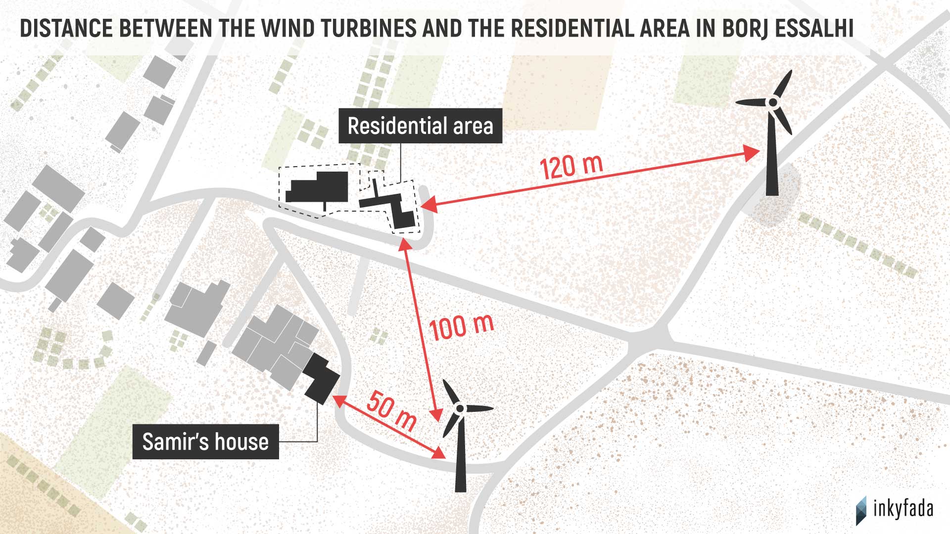 With his measuring tape at the ready, Samir measures the distance between the nearest wind turbine and his home; barely forty meters. "This wind turbine is 70 meters high, even 90 meters if we count the blades. I pray that it will not fall on our heads!" In the absence of any national regulation on the minimum distance between a wind turbine and a house, the international recommendations suggest a minimum distance of 500 meters to avoid nuisance to local residents. This is because, according to a study by the French Agency for Food, Environmental and Occupational Health & Safety, "it is difficult to hear the noise from a wind turbine from a distance of over 500 meters."