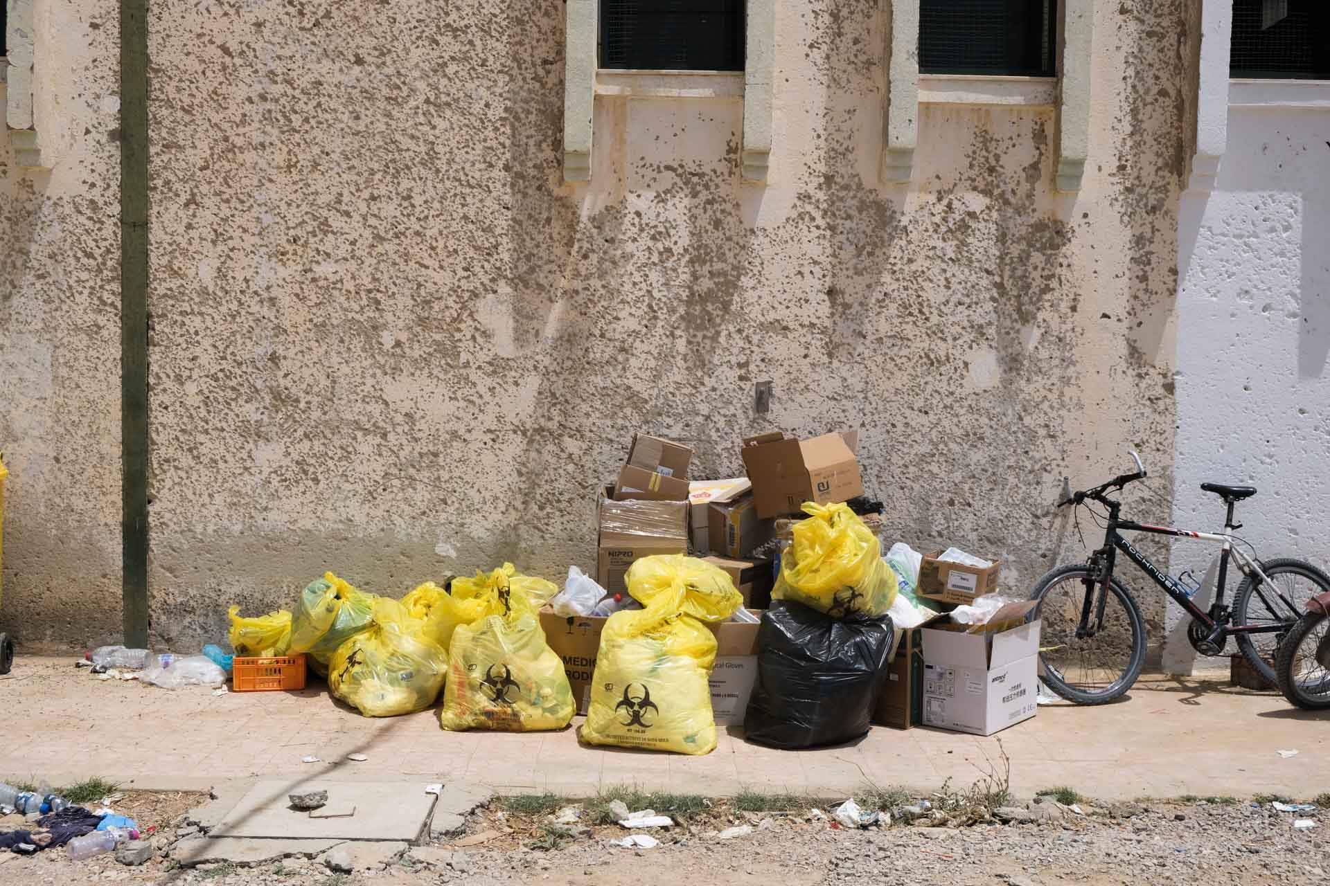 Behind the field hospital, trash bags full of Covid-19 waste lie on the ground.