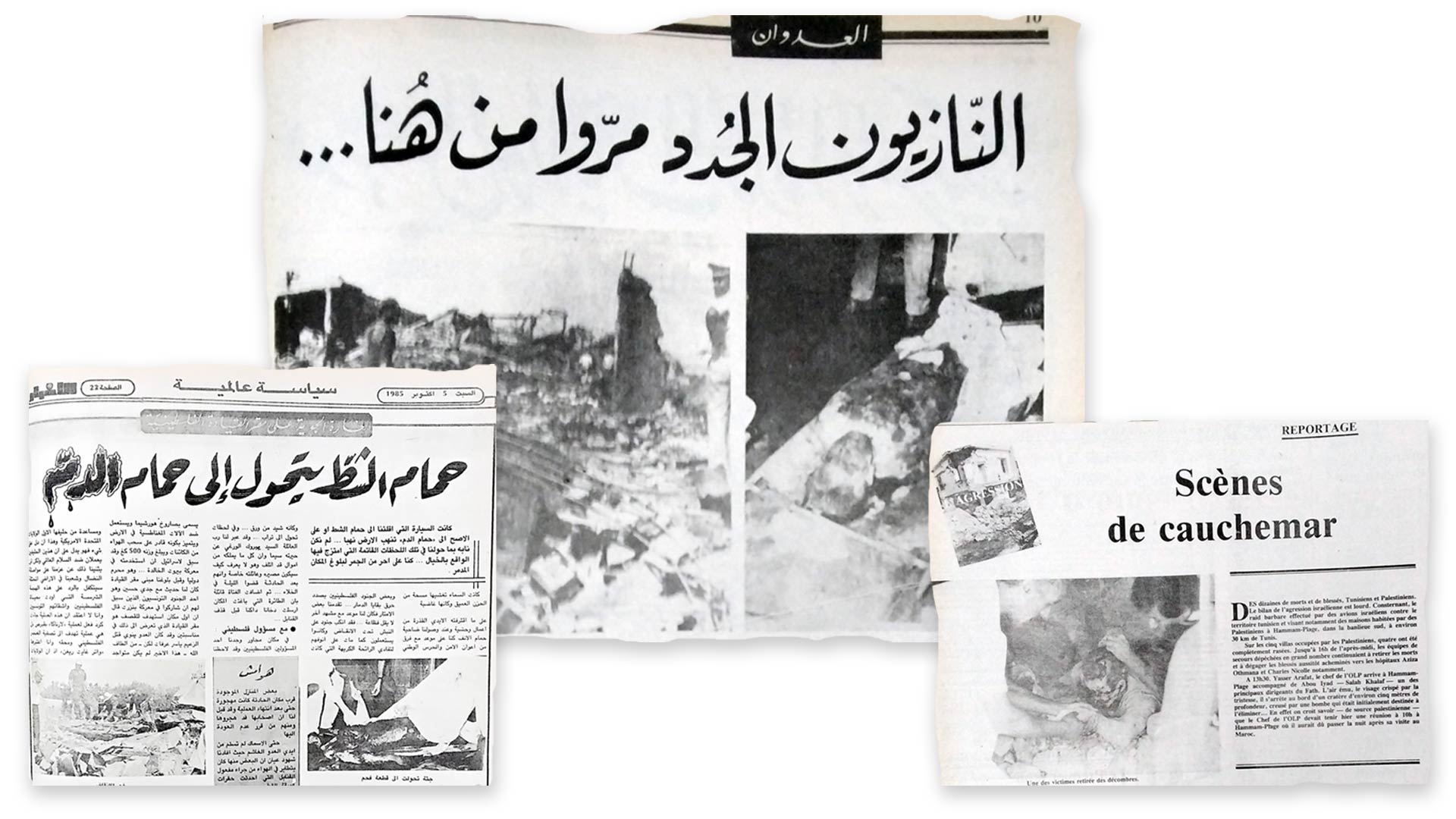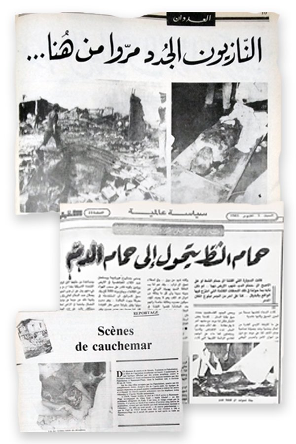 "Many Palestinians were sitting under the shade of a tree counting the victims of the attack. Some in tears, others covered with bandages, all [...] took part in first aid amidst the rubble and burnt-out cars. A doctor told us that half an hour after the bombing, there were several bodies, some of which had been decapitated or had lost their torso." (Le Temps, October 2, 1985, comments from a journalist)