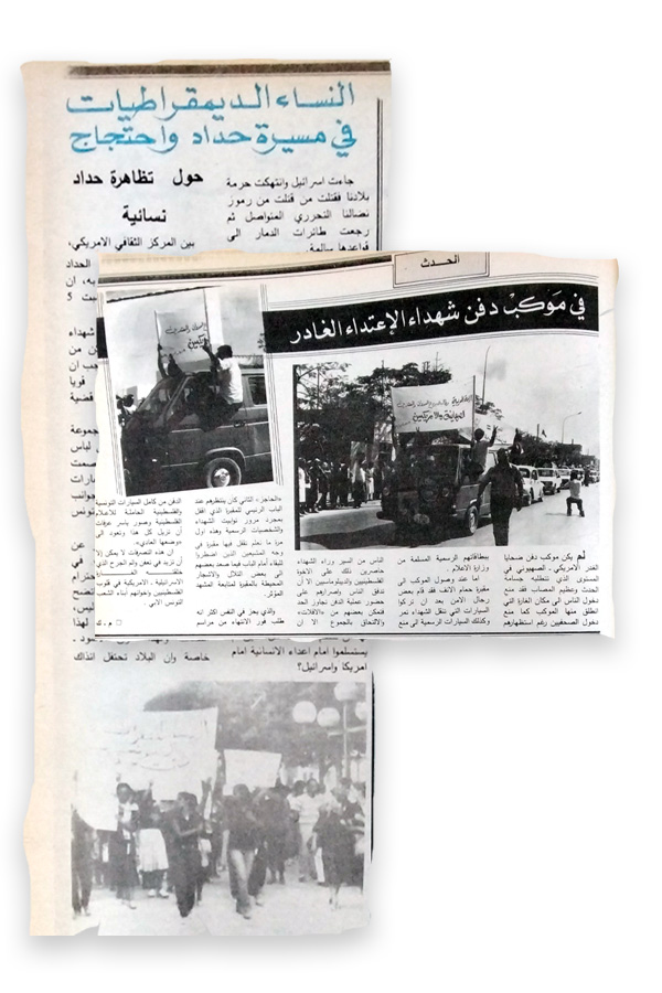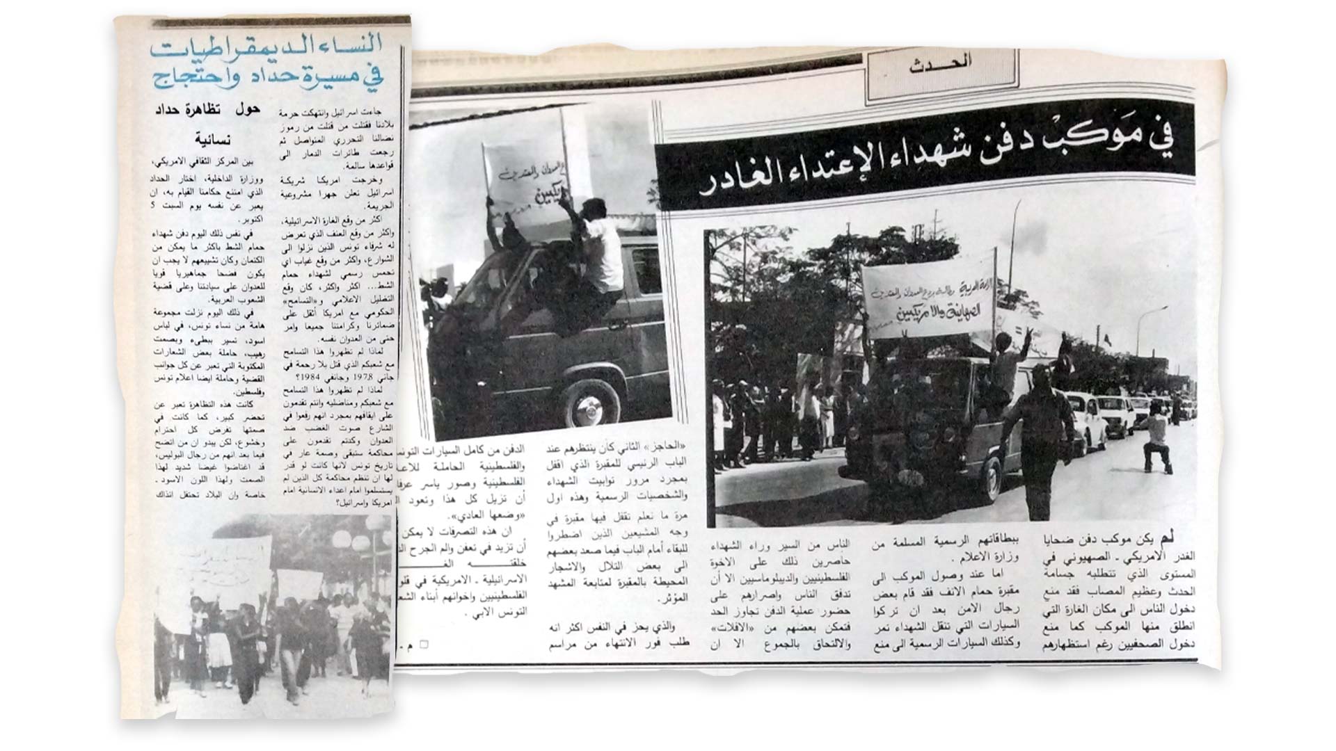 On October 5, a demonstration of "mourning and indignation" organised by activists - mainly belonging to the core group of the Tunisian Association of Democratic Women - sets off from Avenue Bourguiba. The activists are dressed in black and walk slowly "in an impressive silence", bearing slogans and Tunisian and Palestinian flags. The flags were destroyed by the police, who reportedly used their sticks to abuse the demonstrators (Al-tariq Al-jadid, 12 October 1985).