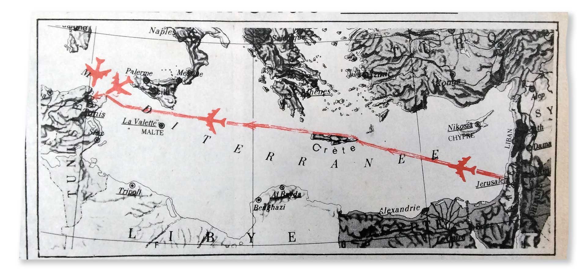 "The supposed itinerary of the Israeli squadron... a crossing of nearly 4800 km (round trip) right under the nose of the sixth fleet of NATO bases" (Le Temps, October 2, 1985), National Archives of Tunisia (Fr).