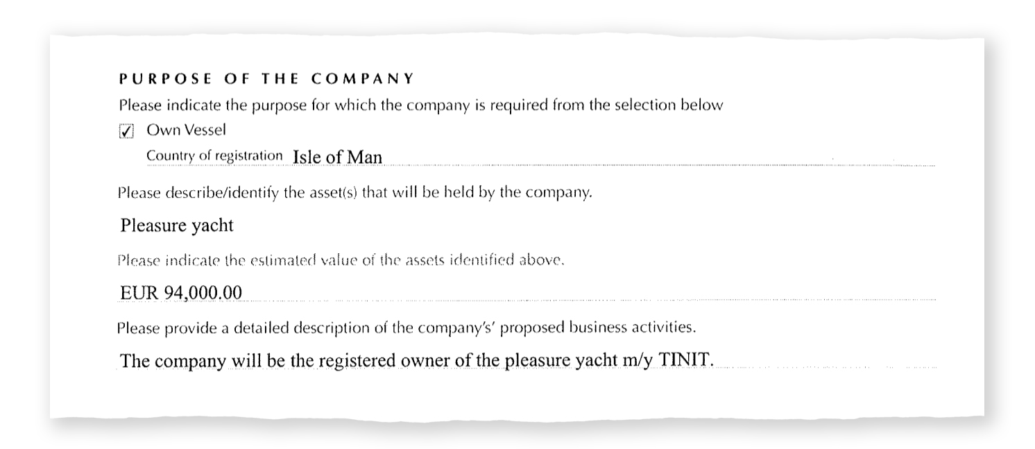 The Tinit was registered in the early 2000s in the Isle of Man, a small autonomous territory attached to the British crown. The Isle of Man, like other territories considered as tax havens, offers something called "flags of convenience" (the maritime equivalent of tax havens), to those who wish to register their boats and avoid taxation in the country in which they reside.