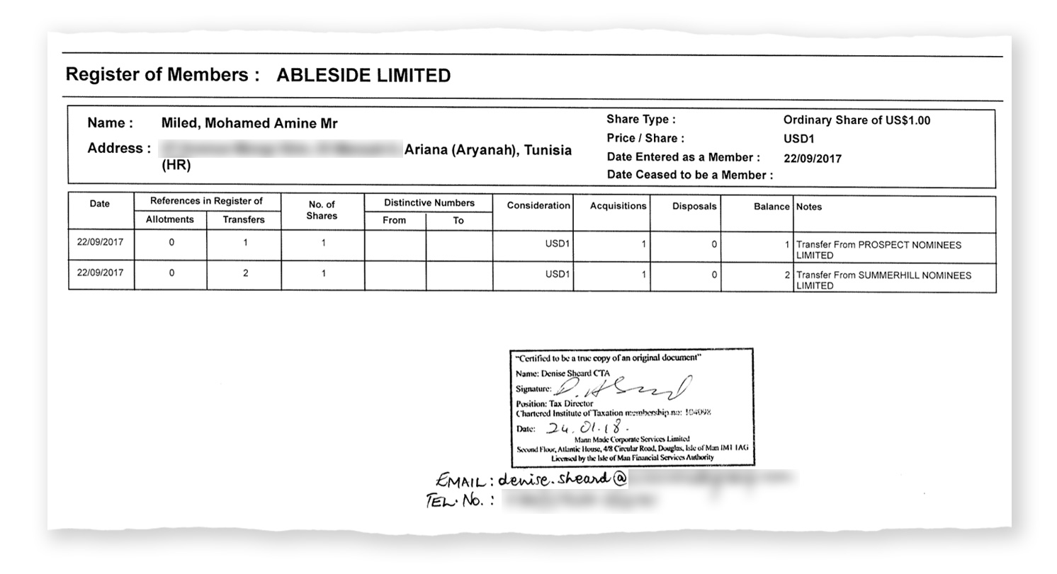 When contacted by inkyfada, Mohamed Amine Miled was vague. He initially asserted that his company VTL is purely an exporter. However, neither the boat nor the company that owns it are registered in the name of this Tunisian company. Mr Miled then further denied being the owner of Ableside Limited through questioning the Trident Trust documents and claiming to have a shareholder certificate in which his cousin Yosri Miled (a resident of Congo), is the real owner. Yet the shareholder certificate found in the Pandora Papers following the transfer of ownership in 2017 only mentions Mohamed Amine Miled's name.