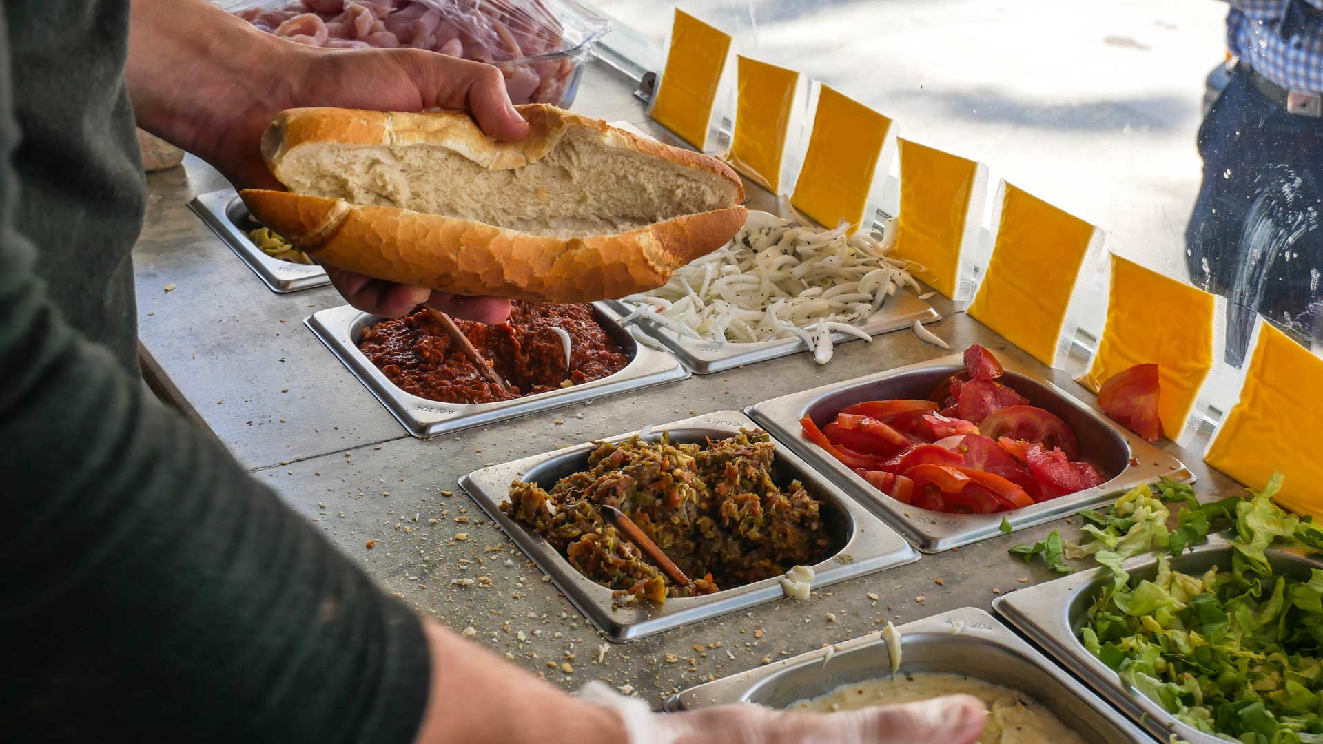 A vendor preparing a sandwich. Photo credit: Noujoud Rejbi