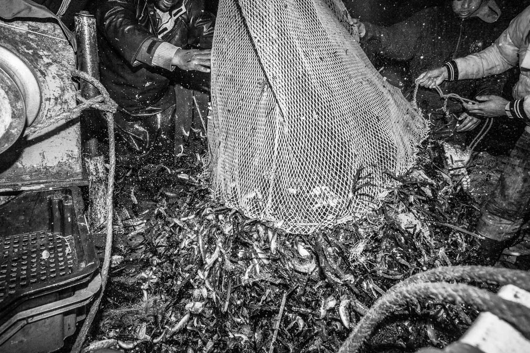 So that he could watch this practice closely, Douraïd Souissi had to hide the identity of these fishermen so that they would accept him on the ship "on condition that their faces were not shown, they know that their act is criminal". The photographer says that this technique causes great bitterness to traditional fishermen who see the seabed threatened by this "easy" technique, even the tension between them reached a high that led a trawling boat to capsize.