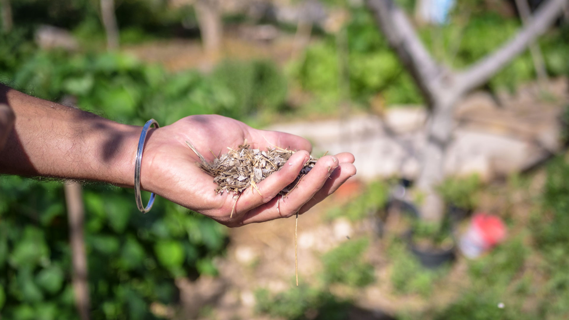 Dried posidonia, spread throughout the Dar Emmima garden, help mitigate the effects of drought. Credit: Driss Rejichi